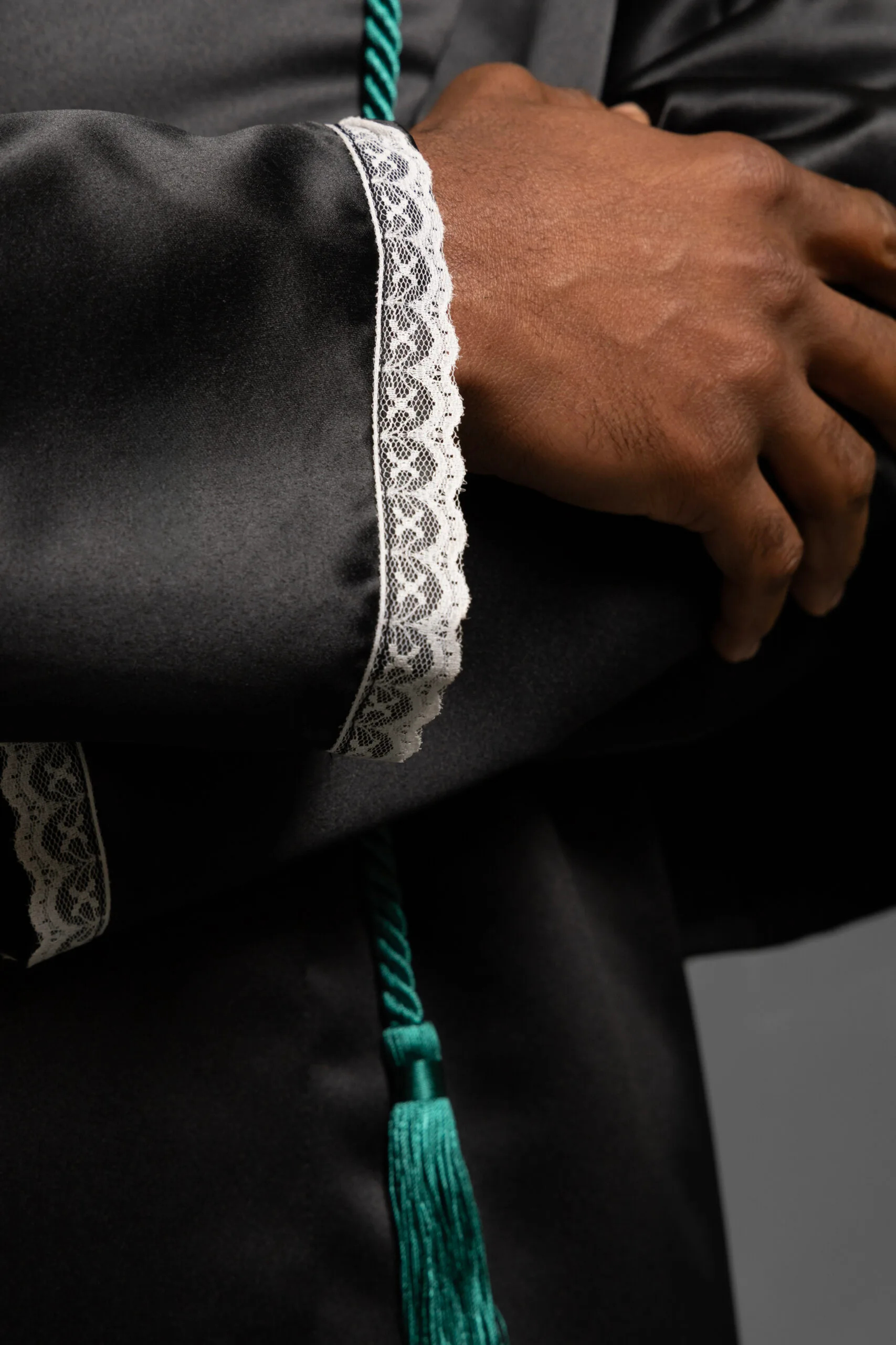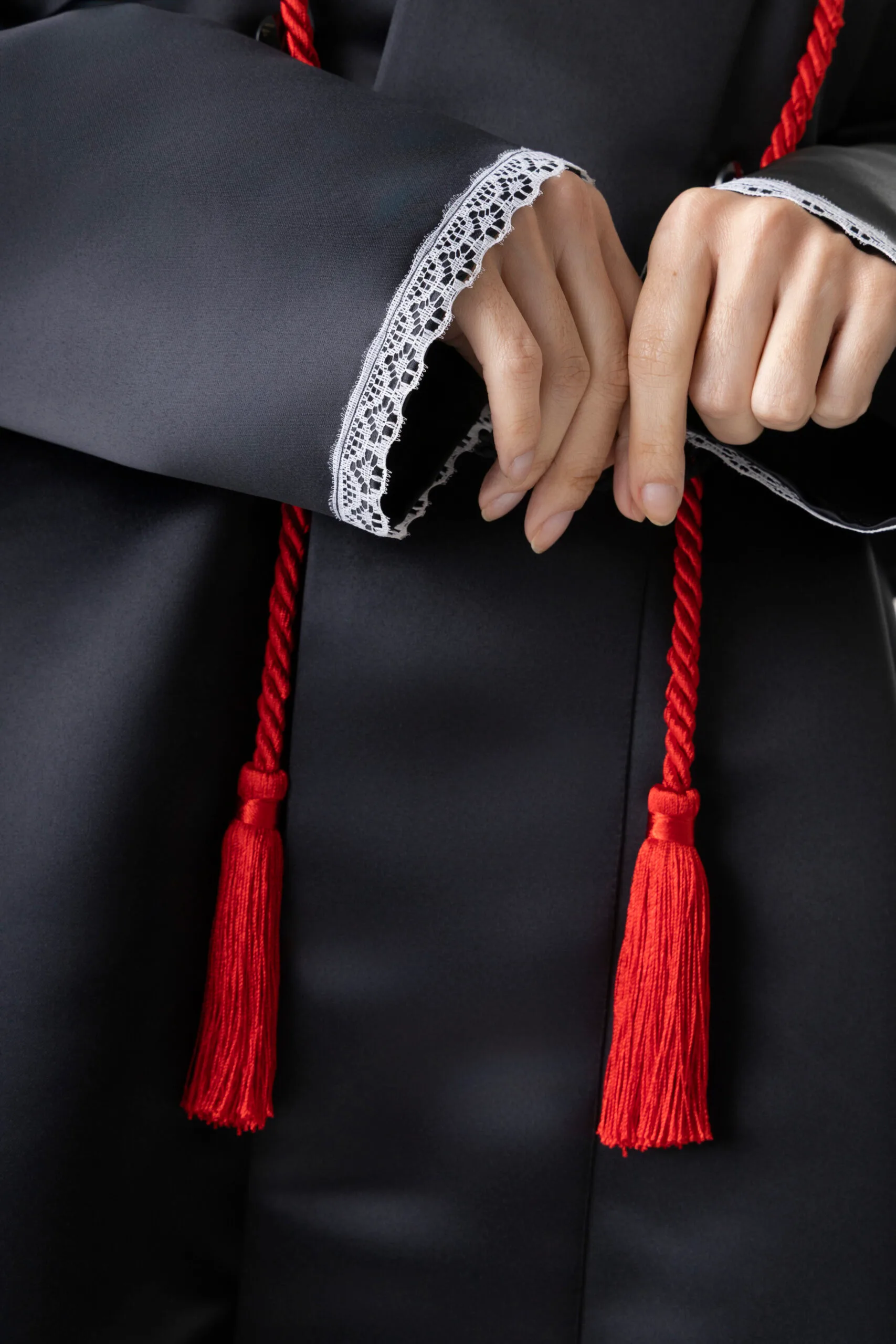 Detalhes exclusivos: cordão torcido com pingentes nas pontas (disponível nas cores preta, verde, vermelha ou branca).