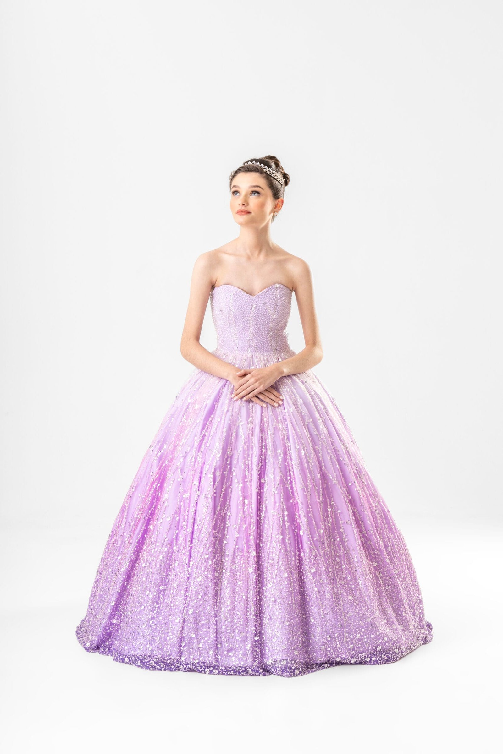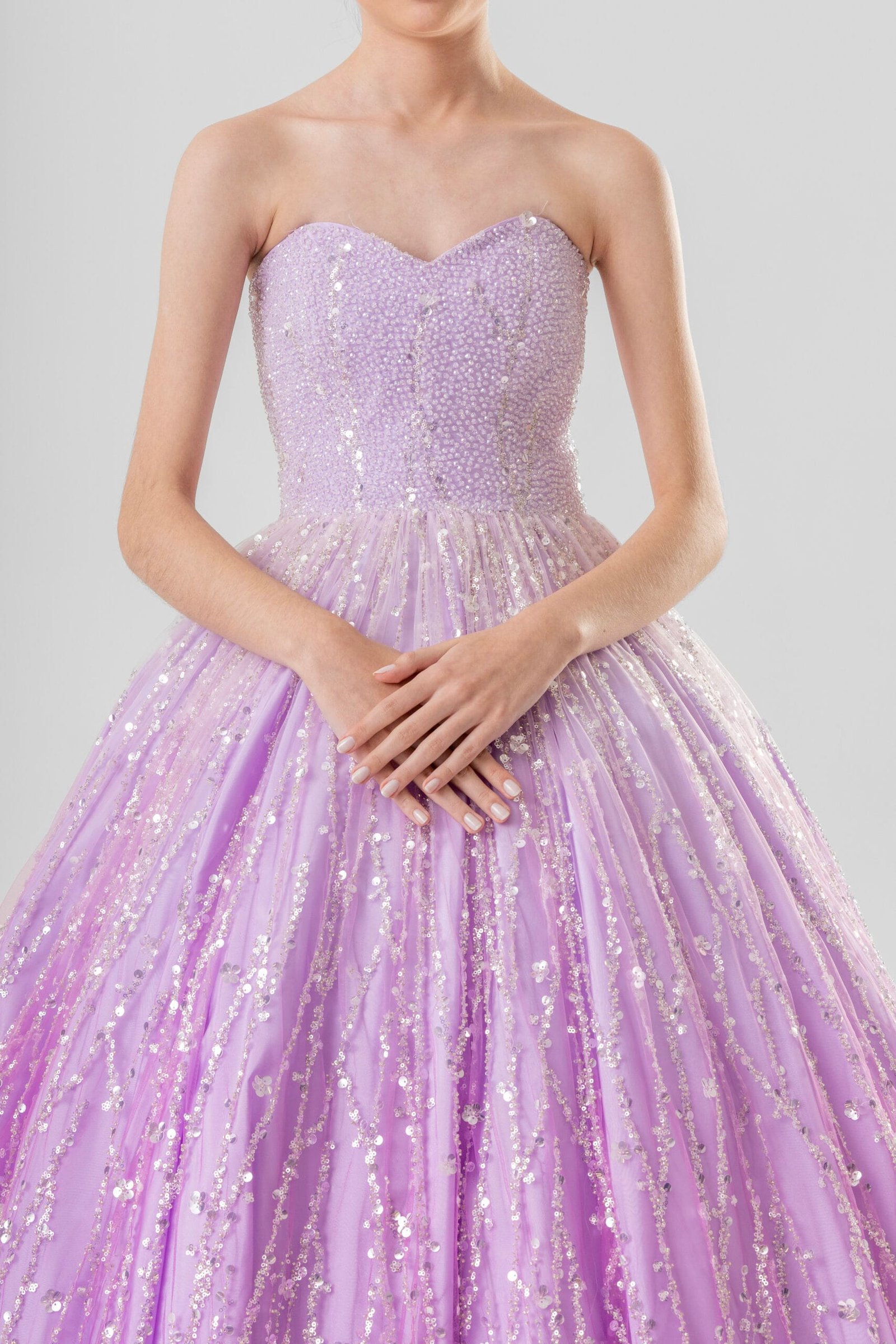Delicado e luminoso, o vestido de valsa Lilac Glow traduz leveza com brilho encantador. O corset tomara que caia valoriza a silhueta com elegância sutil, enquanto o bordado em cristais se espalha pela peça criando um efeito cintilante que acompanha cada movimento. A saia ampla revela um degradê suave em tom lilás, formando uma composição etérea e marcante sob as luzes da pista. Um vestido pensado para uma valsa leve, radiante e inesquecível.