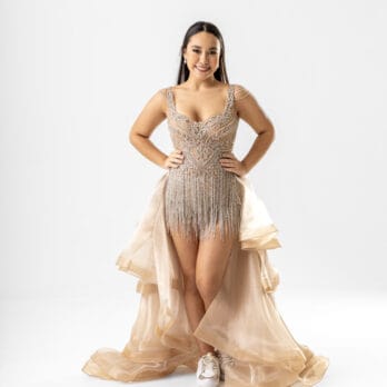 Em tons prateados, o macaquinho Crystal Glow combina o frescor do curto com a intensidade dos cristais Swarovski bordados à mão. As franjas de pedraria garantem movimento e leveza, também nas alças, perfeito para dançar e se destacar