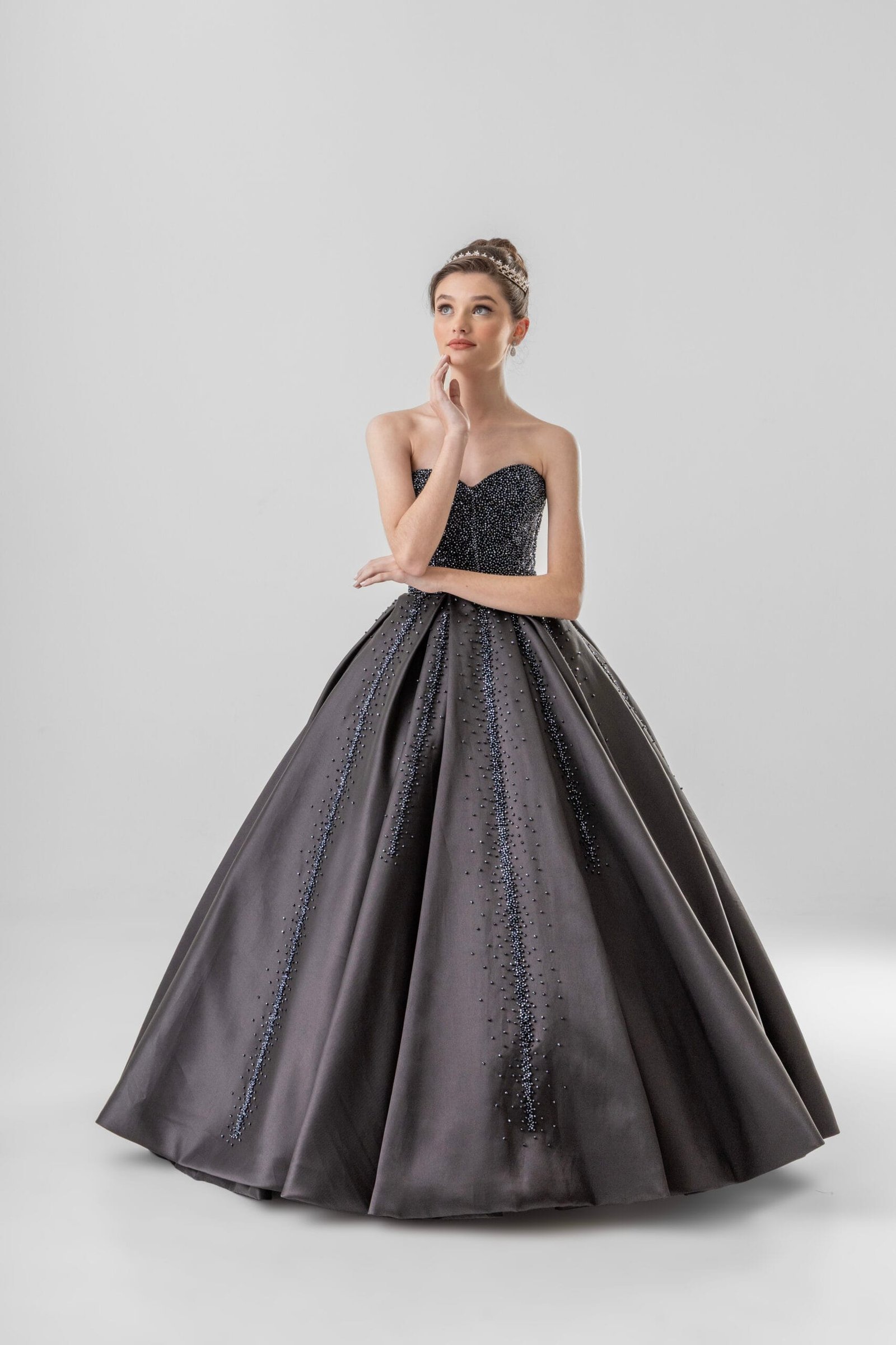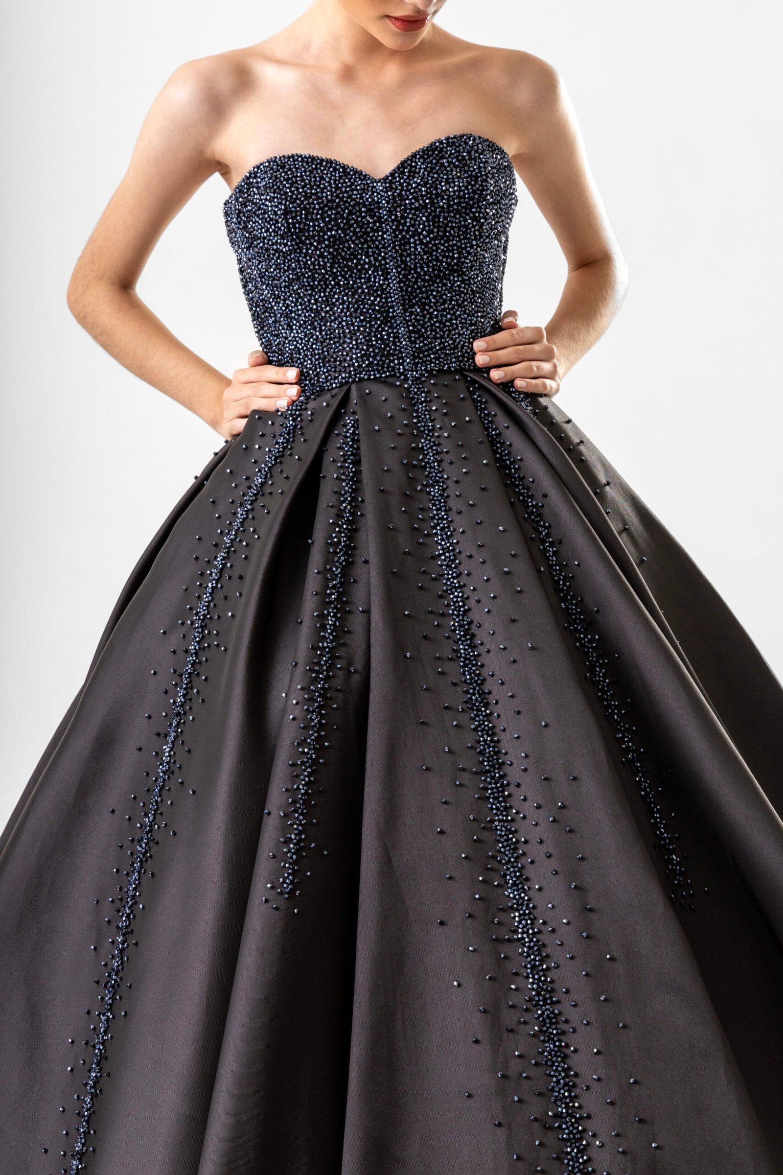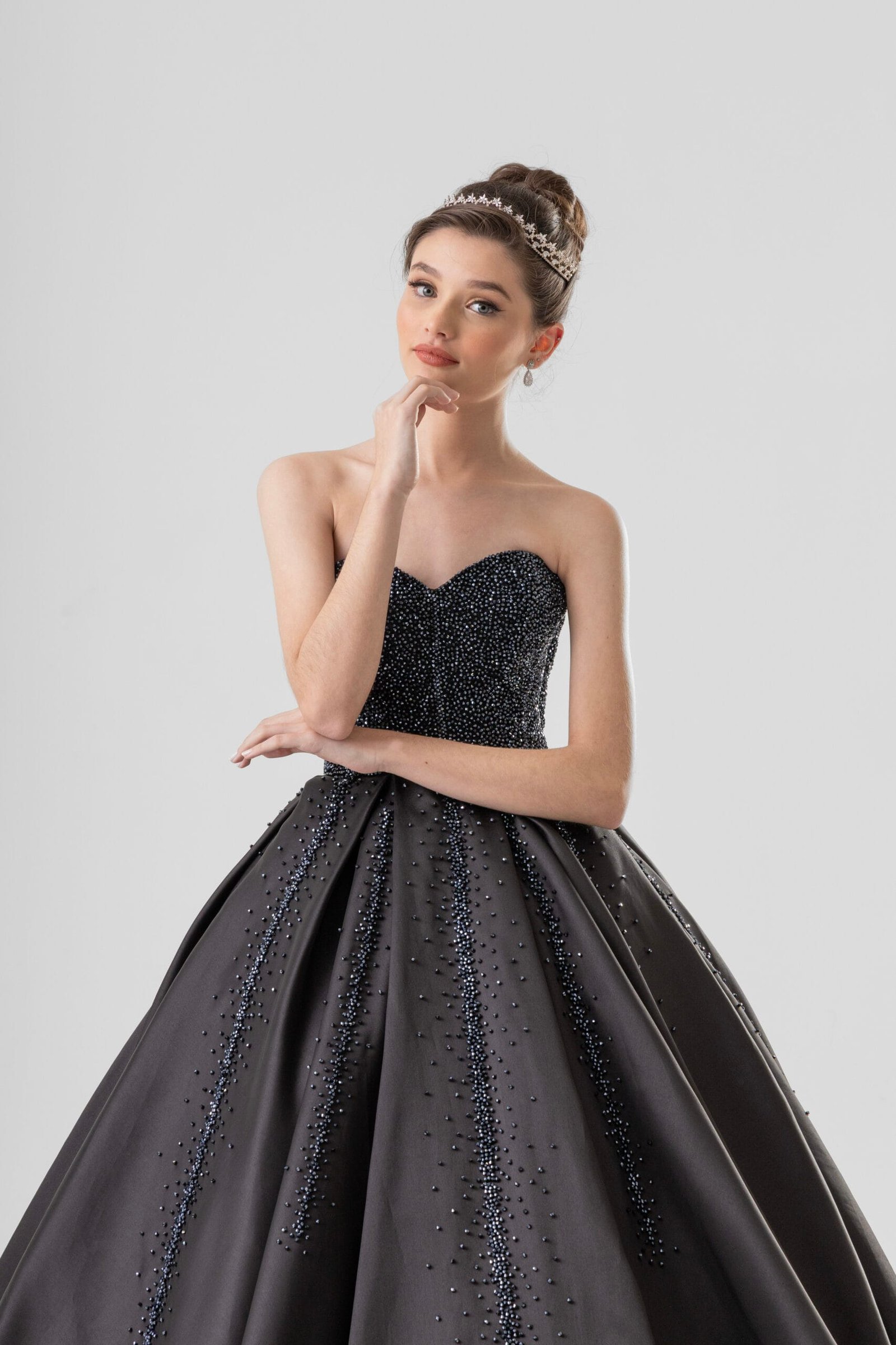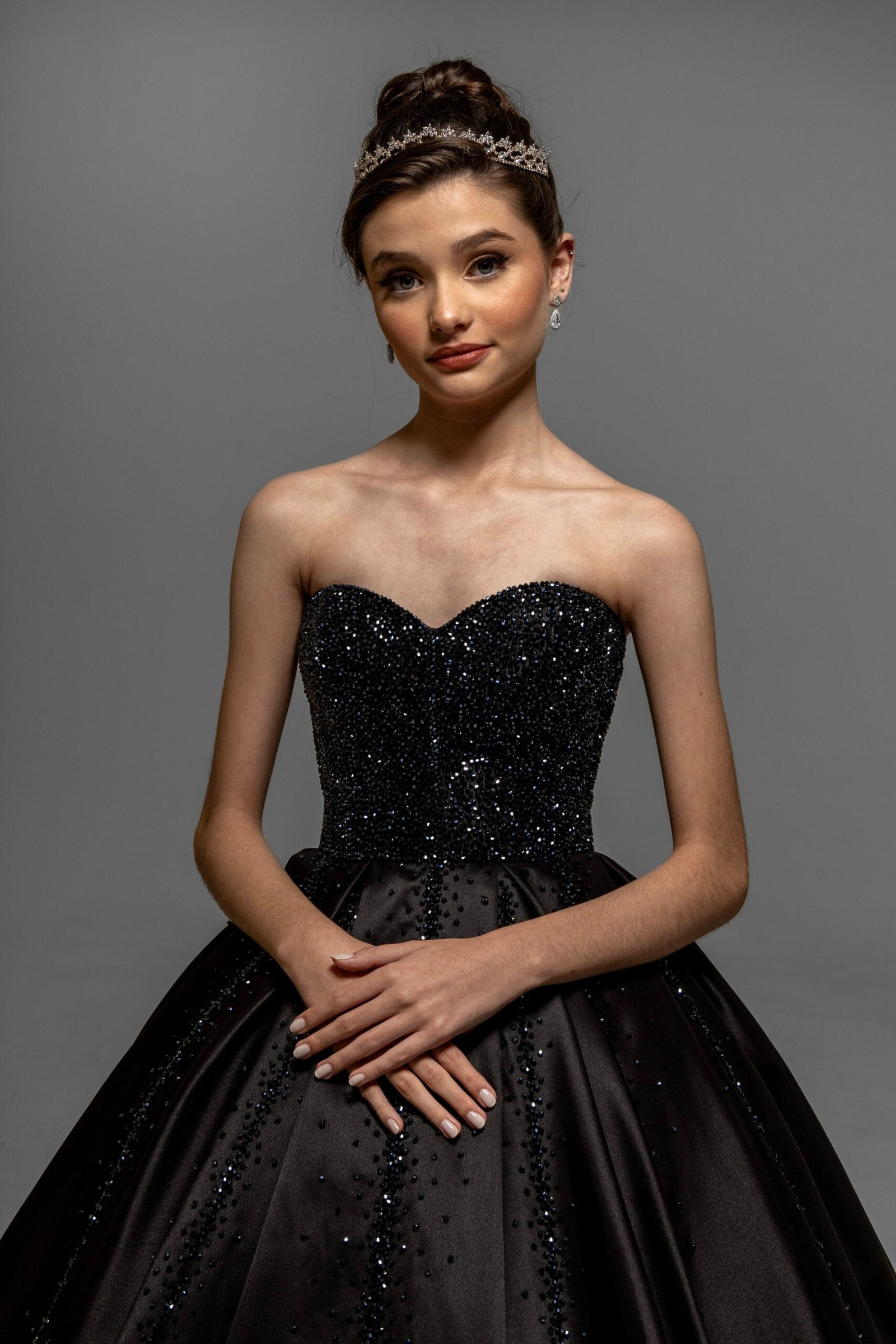 Sofisticado e imponente, o vestido de valsa Midnight Glam traduz elegância com personalidade marcante. O corset tomara que caia é todo bordado em cristais, criando um brilho intenso e refinado que valoriza a silhueta com precisão. A saia ampla em tom preto profundo recebe aplicações delicadas que descem em linhas sutis, formando um efeito moderno e impactante sob as luzes da pista. Um vestido pensado para uma entrada segura, elegante e memorável.