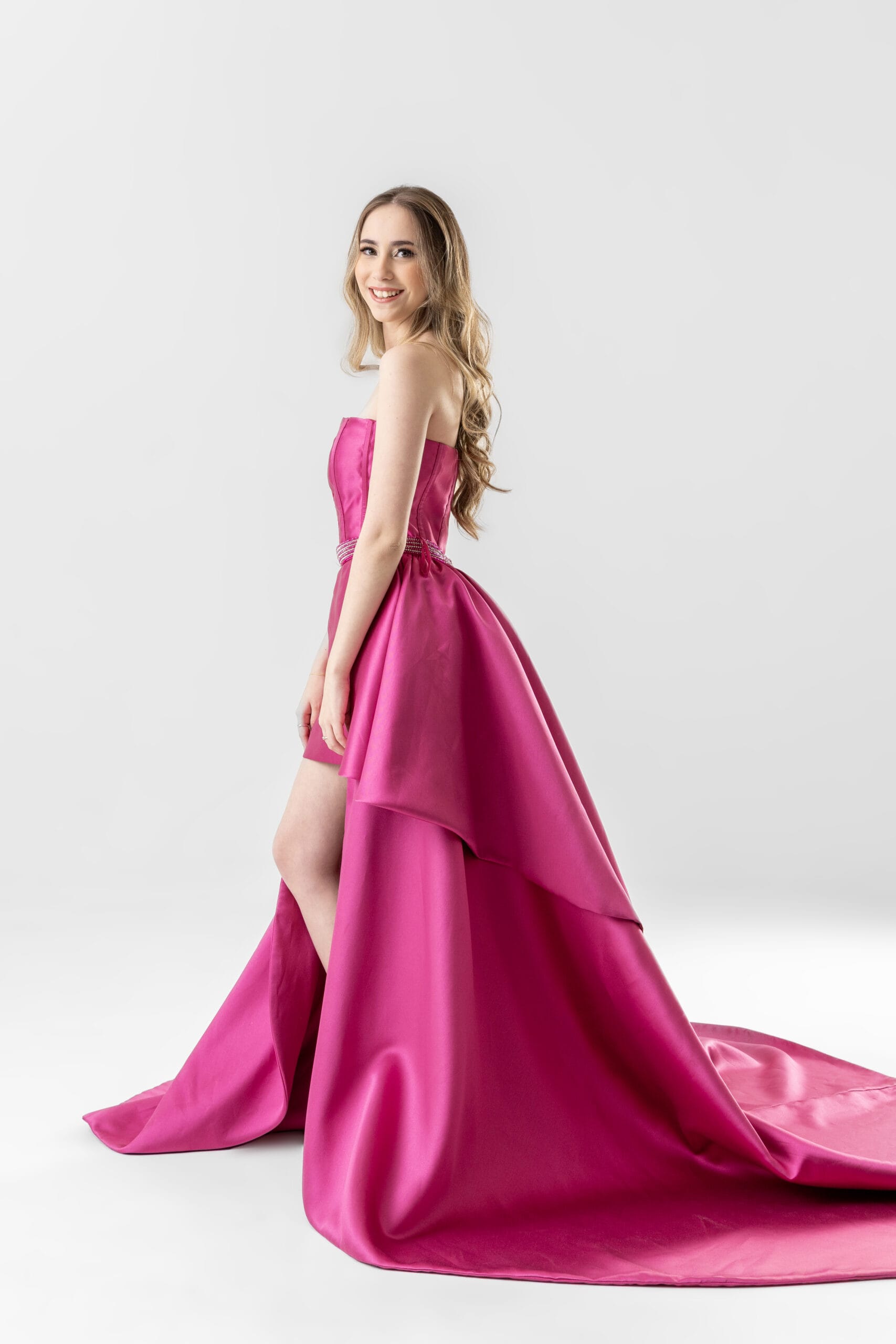 Vestido fúcsia com cauda longa e corpete estruturado, inteiramente bordado em cristais Swarovski. Um toque fashion perfeito para debutantes que amam estar na frente das tendências