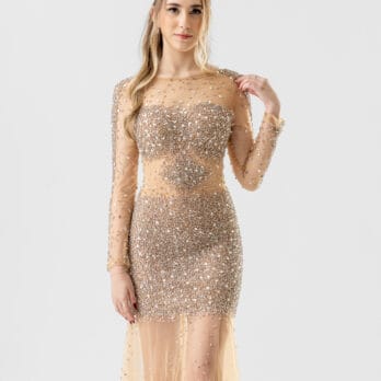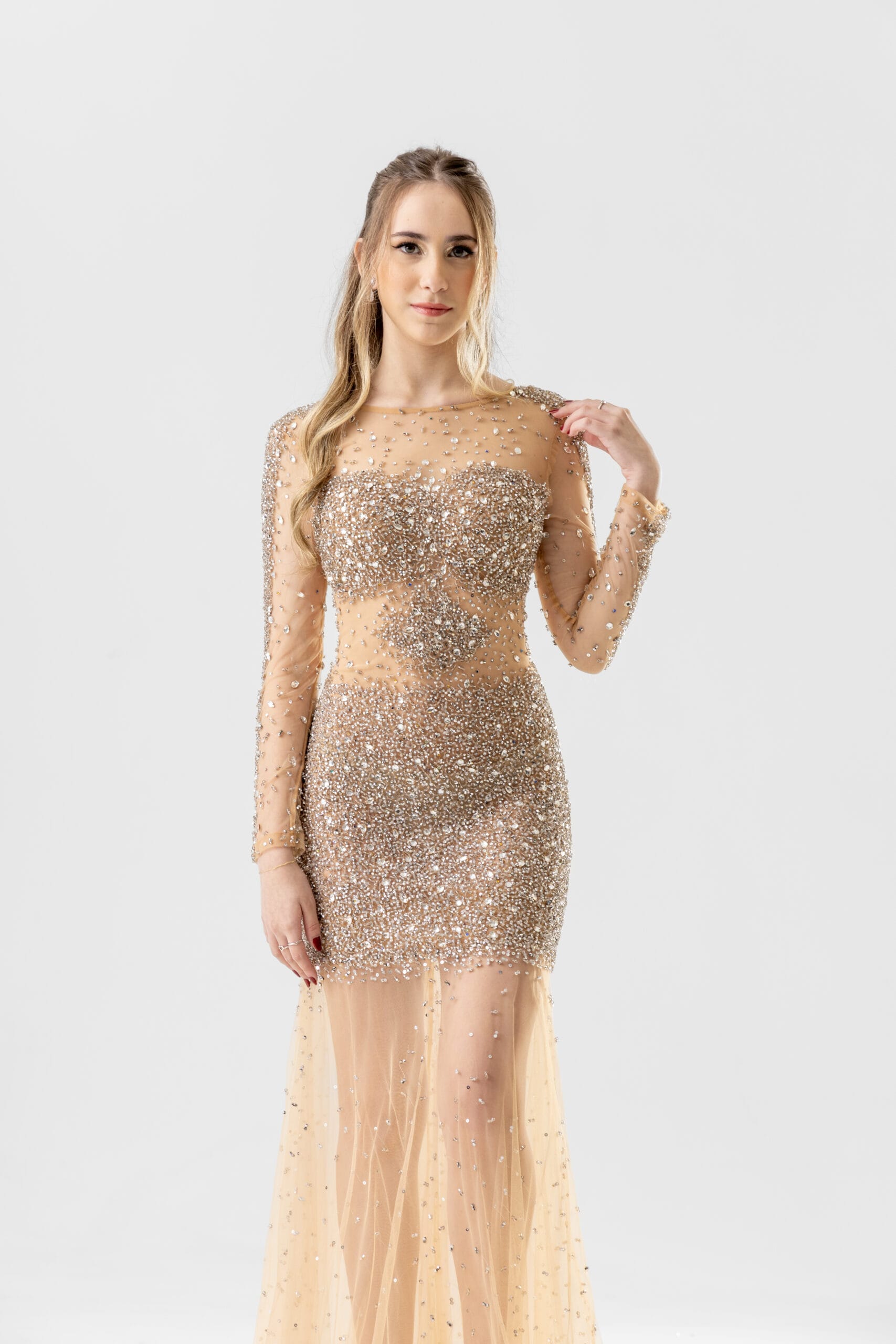 Vestido nude em tule illusion com bordados de cristais Swarovski por toda a peça. Elegante e moderno, é perfeito para debutantes que desejam um visual sofisticado e cheio de luz