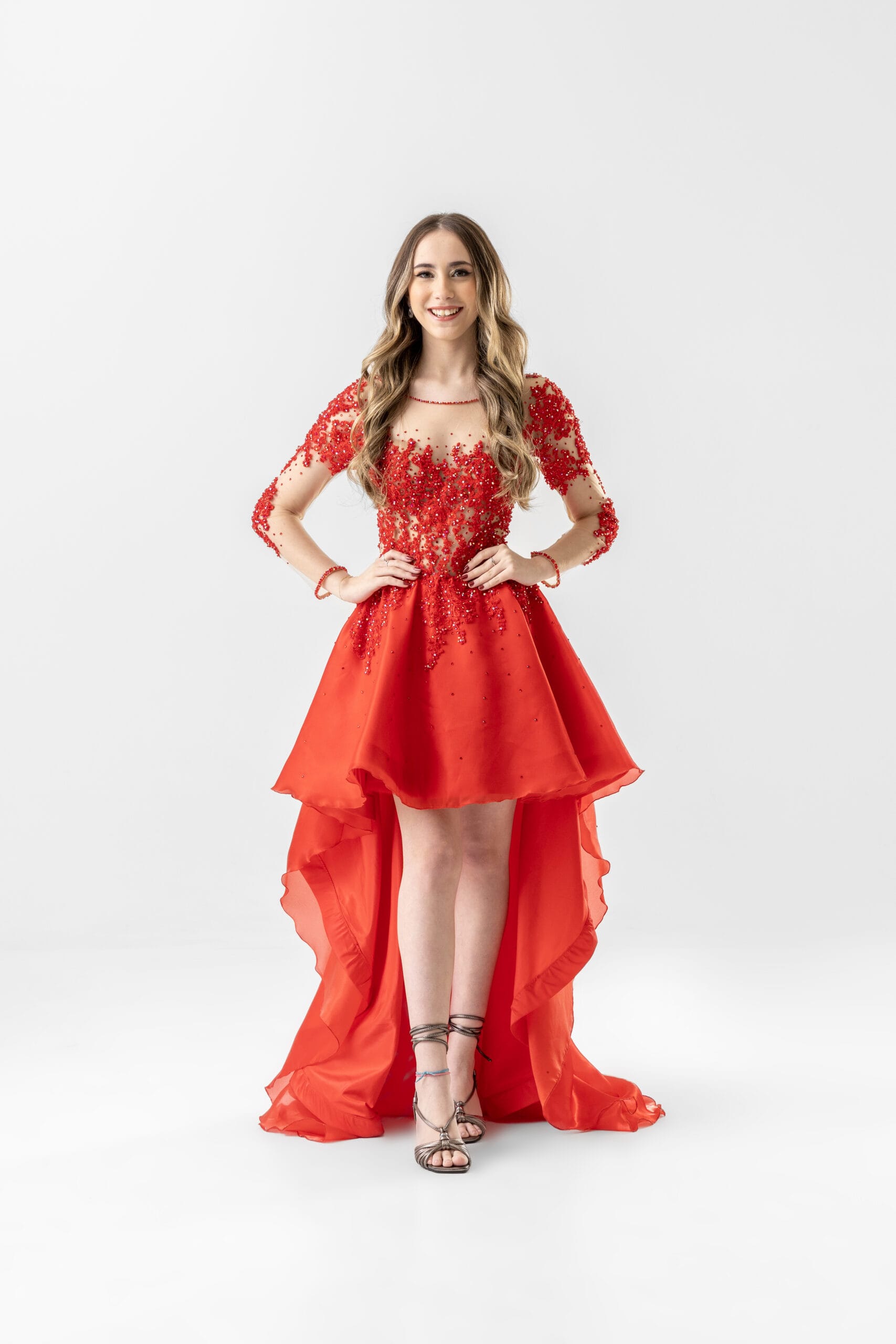 Vestido moderno e ousado em vermelho vibrante, com bordados em cristais na parte superior e saia estilo mullet que mistura elegância e movimento. Ideal para quem deseja marcar presença na pista de dança