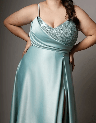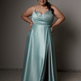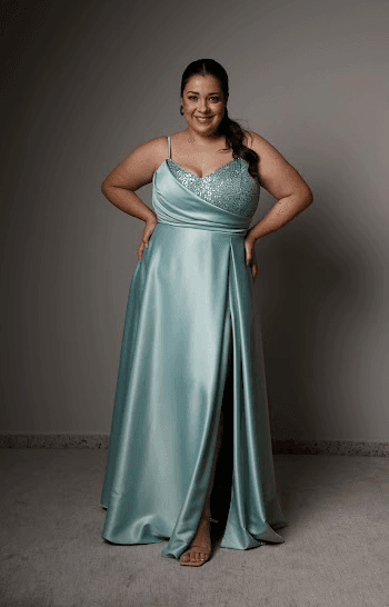 O Vestido Acqua di Cristal é uma ode à delicadeza e ao movimento. Feito em cetim acetinado, o modelo apresenta busto bordado com pedrarias e cristais que refletem a luz de forma suave, criando um brilho sofisticado. O decote em “V” e a fenda frontal alongam a silhueta, enquanto o drapeado diagonal valoriza a cintura com elegância. O tom acqua traz um toque refrescante e moderno, ideal para madrinhas, formandas e convidadas que buscam leveza e presença