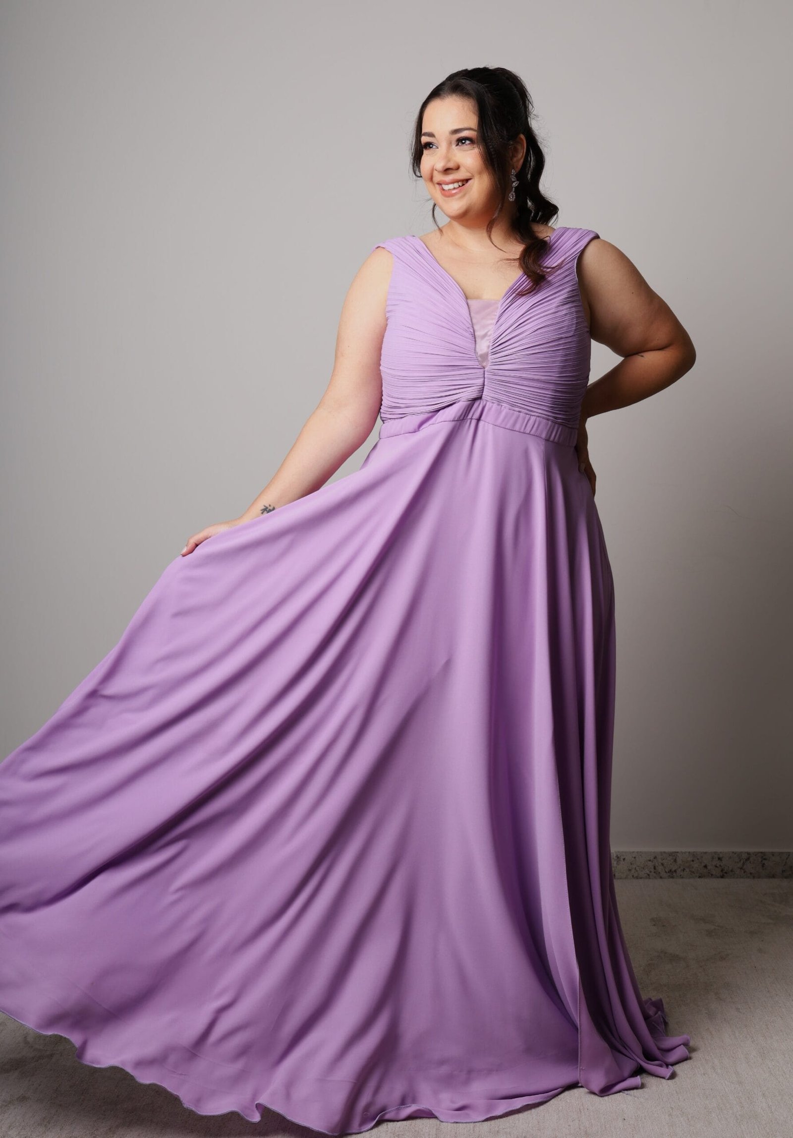 A musseline lilás desenha um visual leve e acolhedor, com busto plissado que valoriza o colo de forma delicada e elegante. A cintura suavemente marcada dá início à saia godê, que cai solta, fluida e com movimento natural a cada passo. Um vestido que equilibra conforto, feminilidade e presença