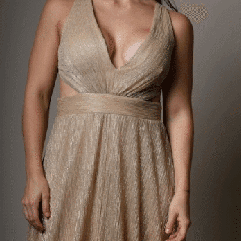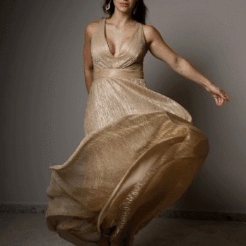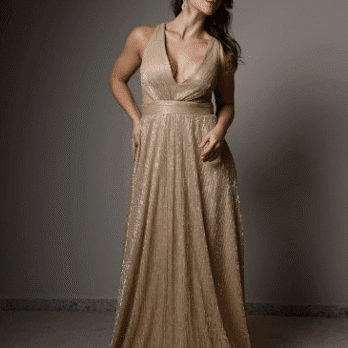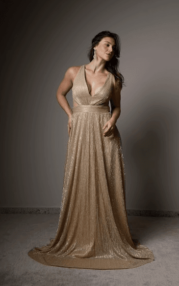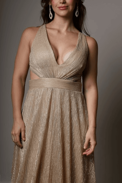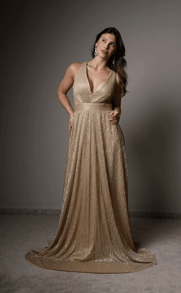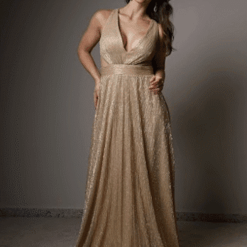 O Vestido Aura traz o encanto do dourado em uma leitura moderna e sofisticada. Confeccionado em tecido plissado com brilho metálico, o modelo destaca o decote profundo e a cintura marcada, que valorizam a silhueta com leveza e movimento. A saia fluida e o caimento impecável traduzem elegância natural