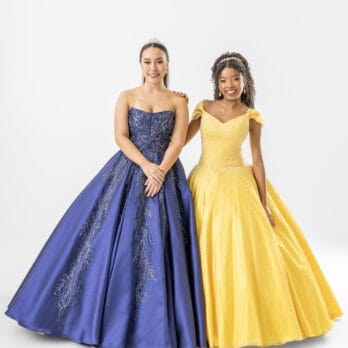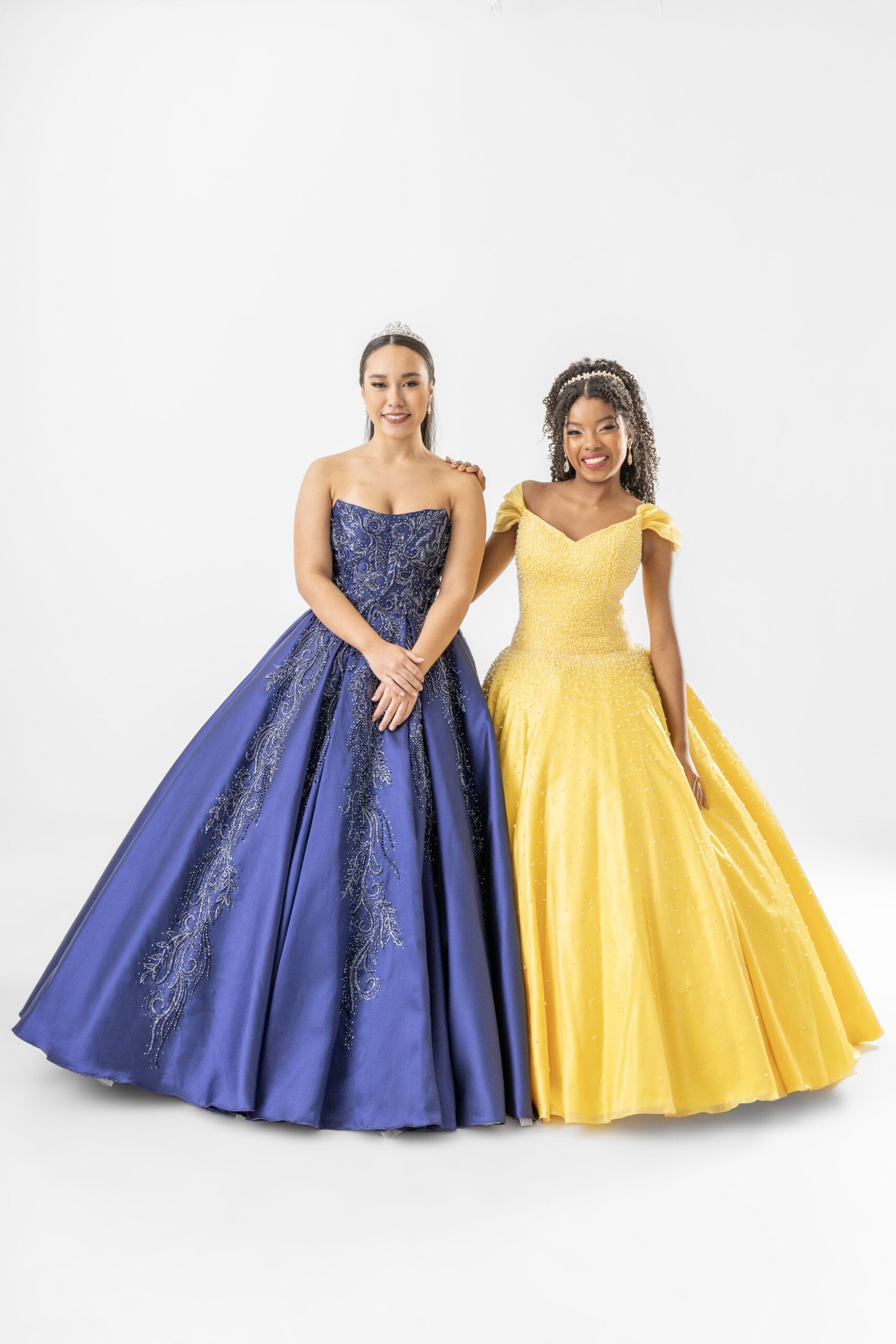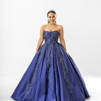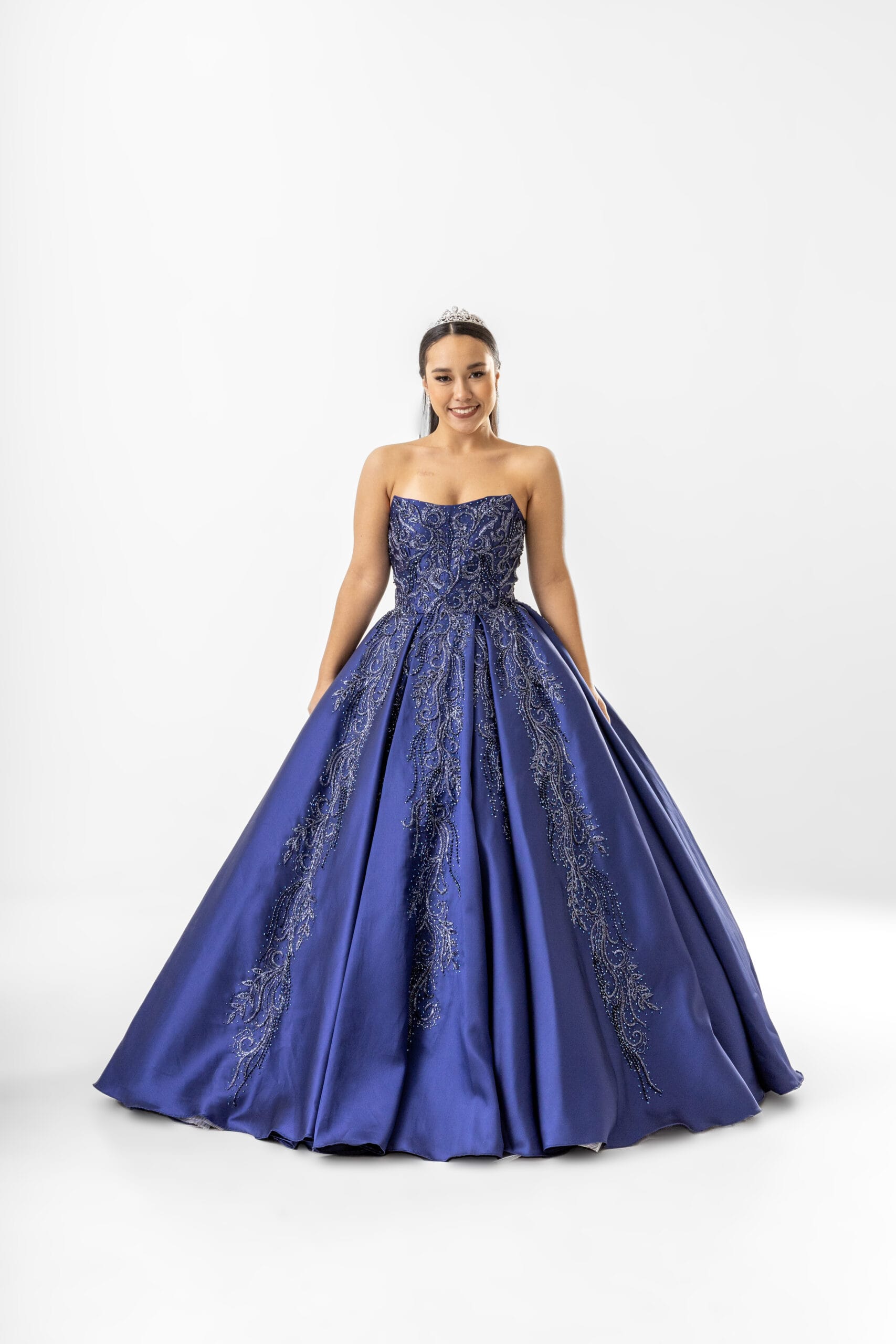 Um vestido imponente em azul royal, com bordados luxuosos em cristais Swarovski que descem pelo corpete ate a saia, criando um efeito de cascata cintilante. A cor intensa transmite confianca e realeza, enquanto o brilho dos cristais garante a aura de sonho e protagonismo que toda debutante merece.