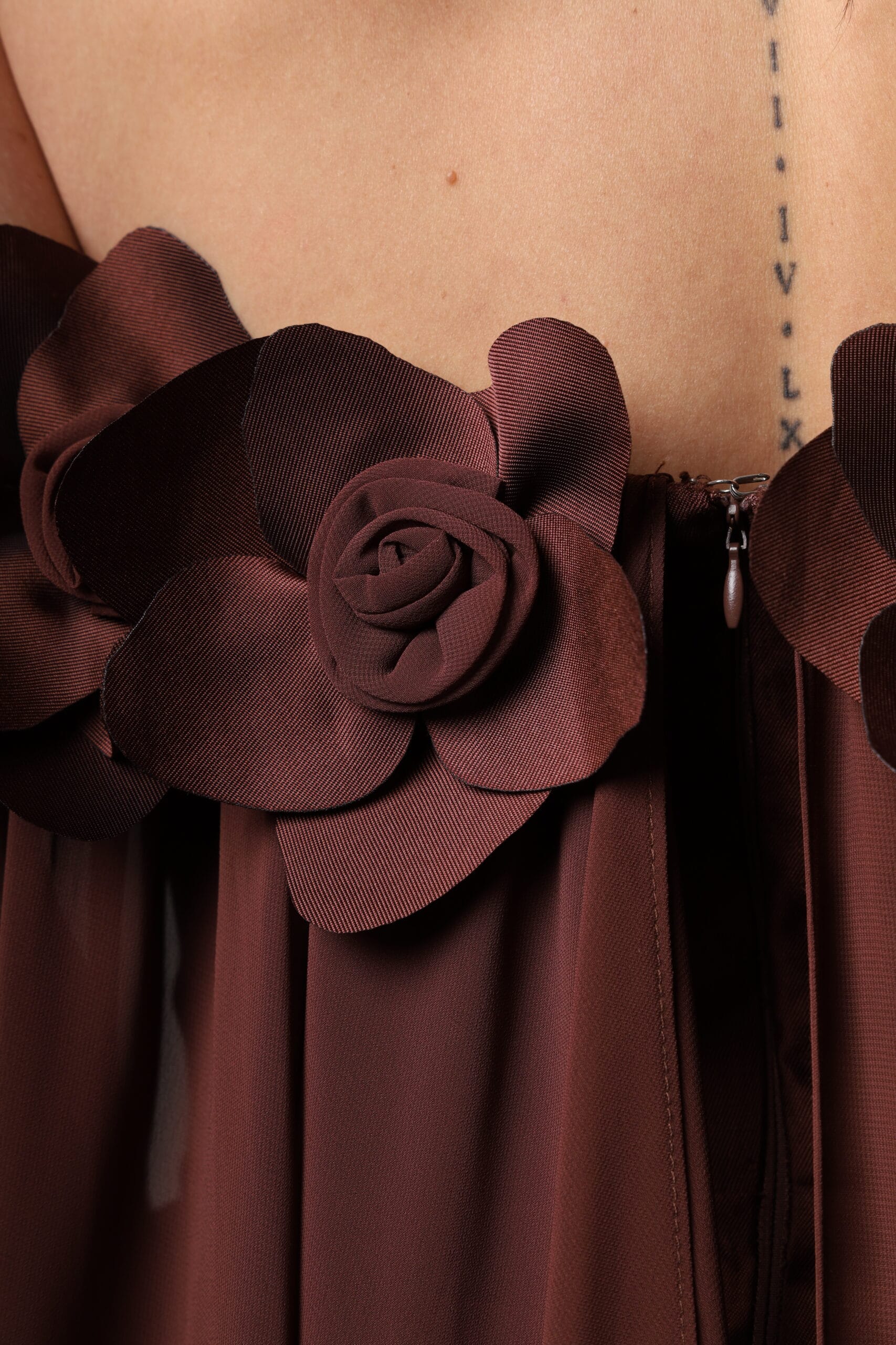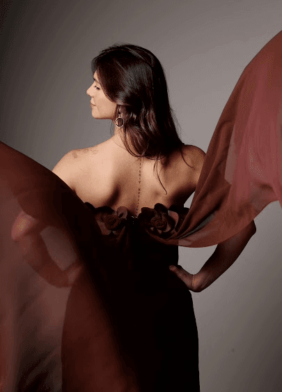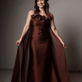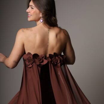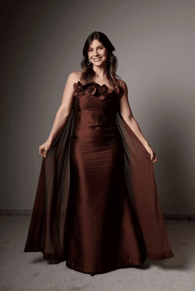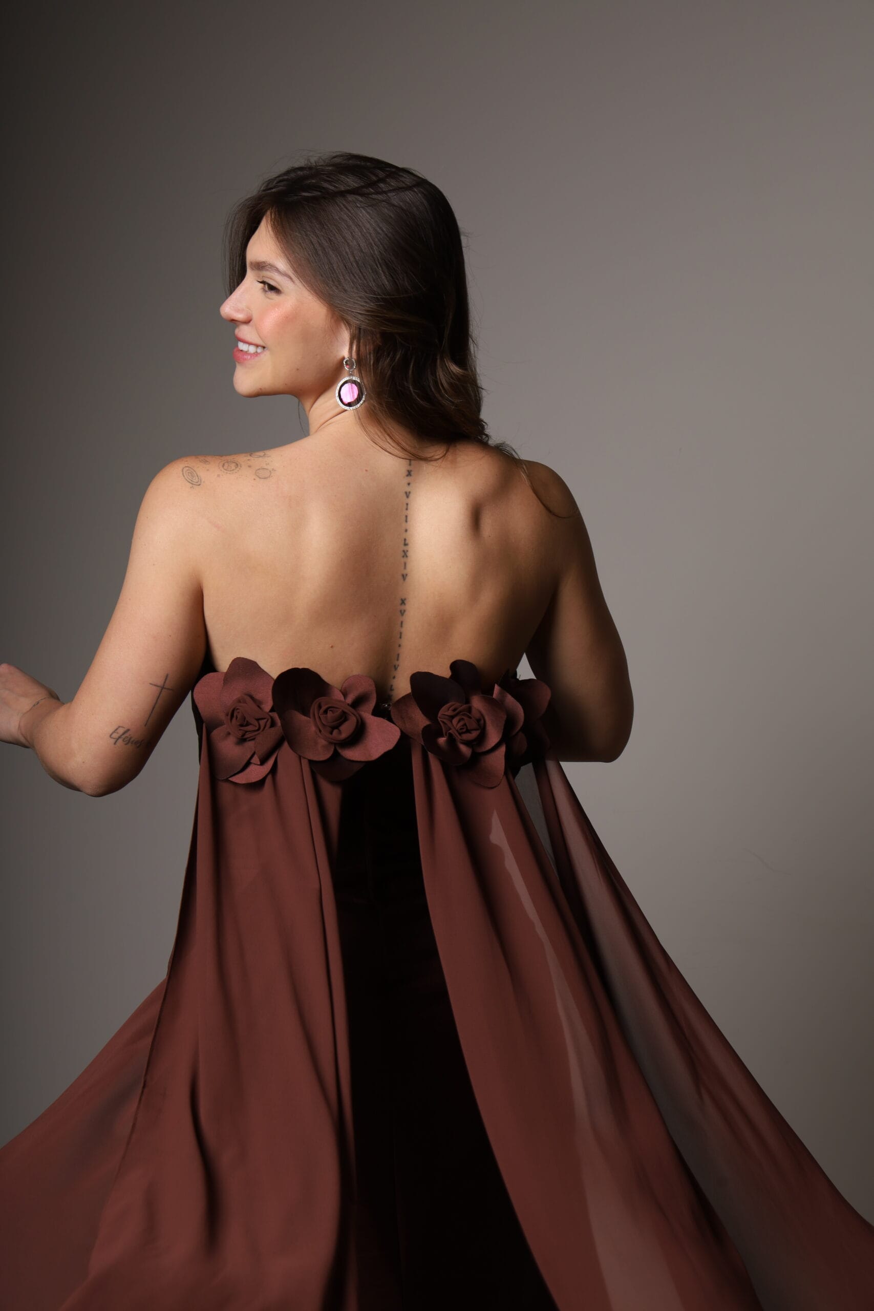 O Vestido Canela é a tradução perfeita da elegância com personalidade. Feito em zibeline acetinado, ele valoriza a silhueta com corte ajustado e caimento estruturado. O tom terroso sofisticado é realçado pelas flores aplicadas no busto, que ganham leveza com as duas capas em chiffon esvoaçante que descem pelos ombros. Um modelo que combina impacto e suavidade — ideal para madrinhas, mães de noiva ou convidadas que desejam um look inesquecível.