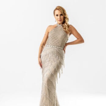 Inspirado no glamour das divas do cinema clássico, este vestido champagne é inteiramente trabalhado com franjas bordadas em pedrarias que acompanham o movimento do corpo. O decote halter valoriza os ombros e o colo, enquanto o caimento fluido das franjas traz leveza e sofisticação. Perfeito para dançar e brilhar em noites inesquecíveis.