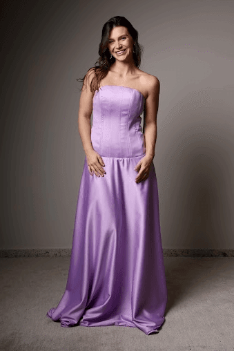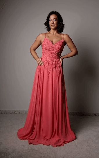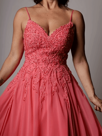 Feito com musseline fluida e corpo em renda bordada, o vestido Coraline combina movimento e delicadeza com um toque vibrante. O tom coral ilumina a pele, enquanto o busto estruturado valoriza o colo e a cintura. Ideal para madrinhas, formandas ou convidadas que buscam um visual leve e marcante, unindo romantismo e elegância contemporânea.