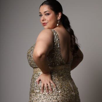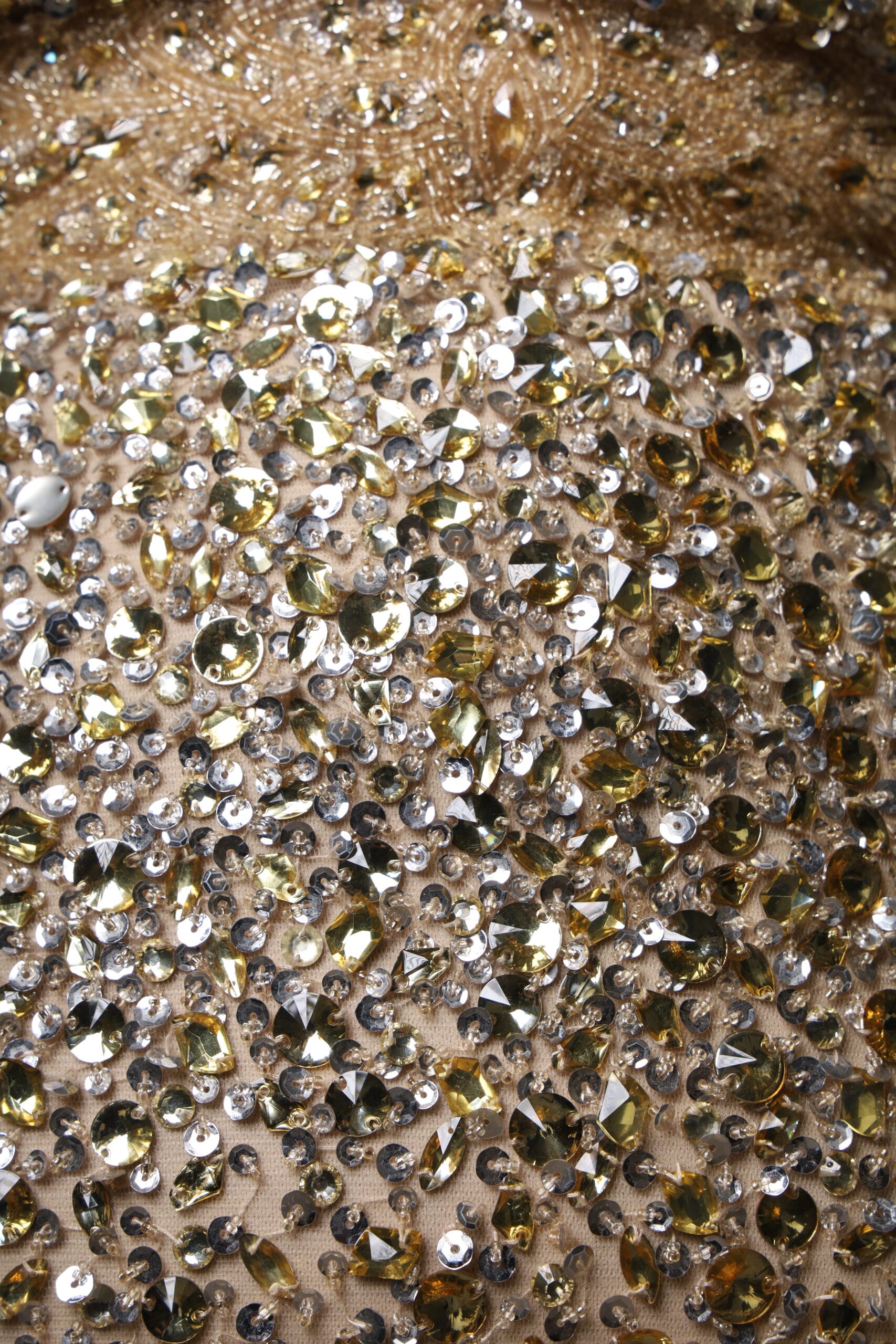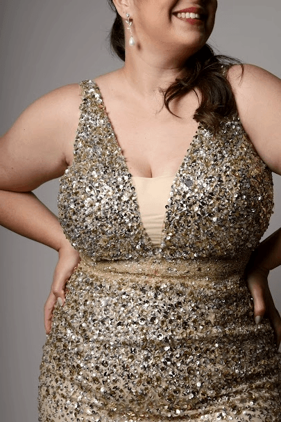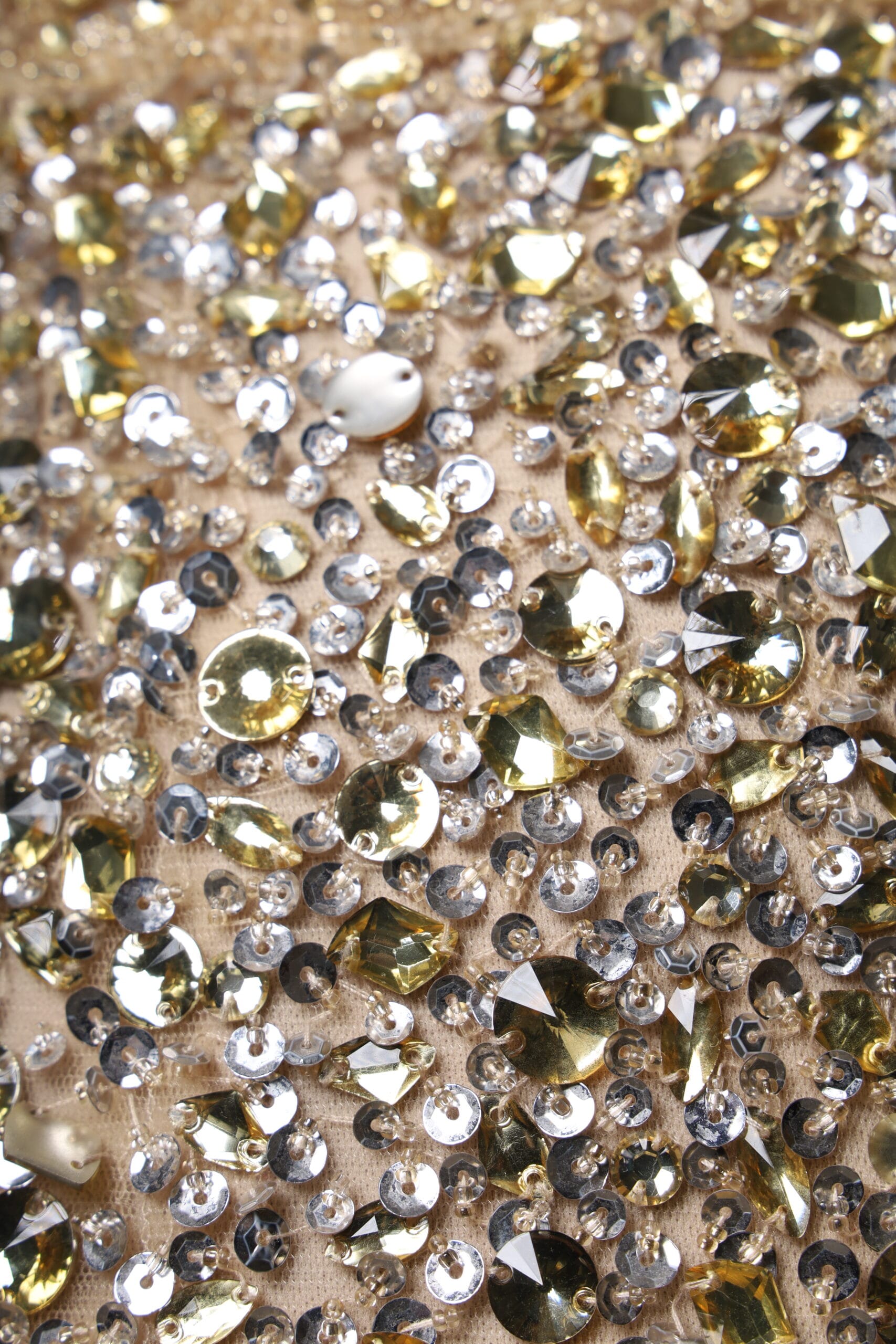 O Vestido Dourado Estelar é puro impacto e sofisticação. Bordado inteiramente em pedrarias e cristais que refletem a luz como constelações, o modelo celebra o poder do brilho em uma silhueta que valoriza as curvas com elegância. O decote profundo em tule transparente equilibra sensualidade e classe, enquanto a saia em tule leve cria movimento sutil e refinado. Ideal para madrinhas, formandas e convidadas que desejam um look de presença marcante e acabamento impecável.