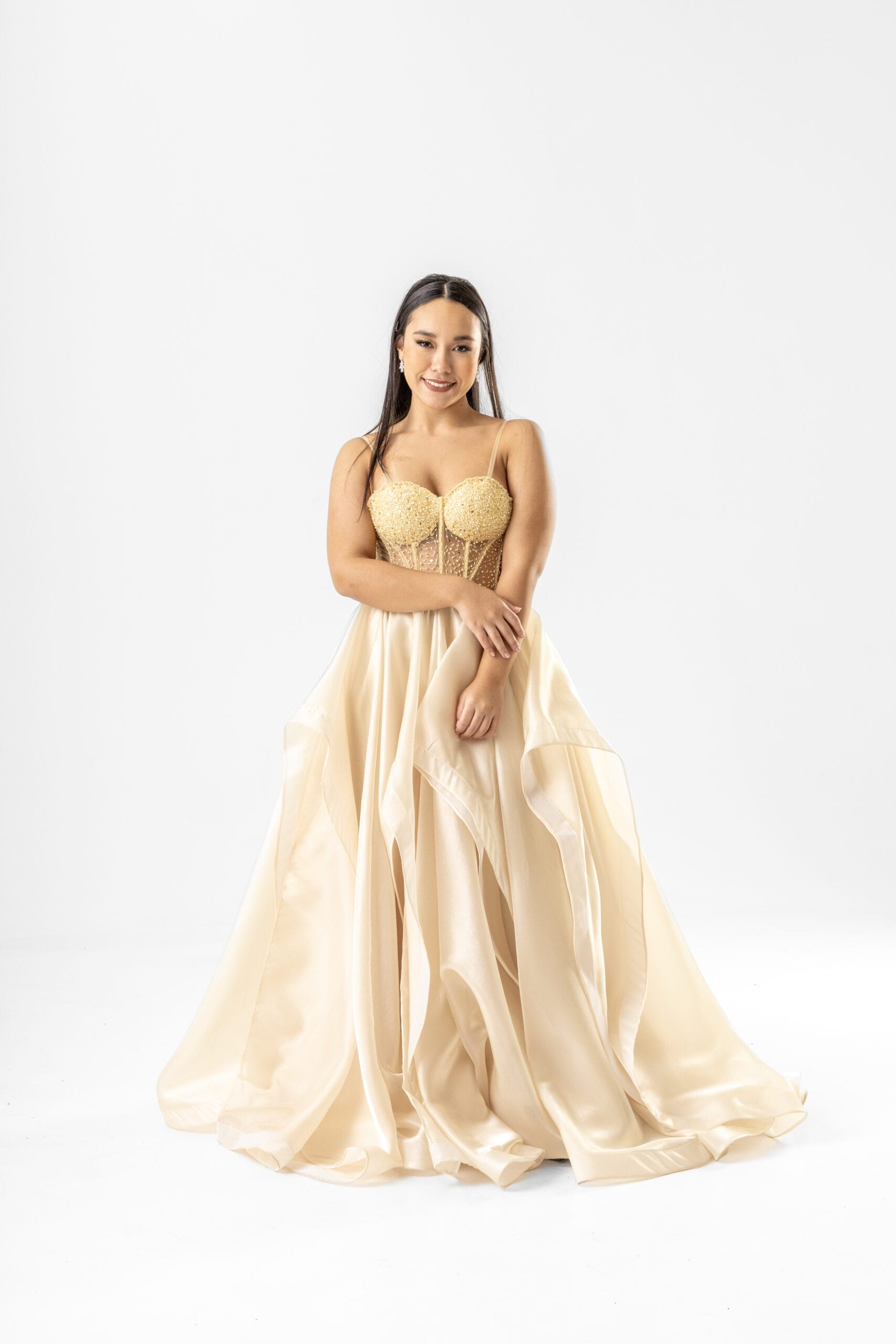 Um vestido digno de contos de fadas, com corpete estruturado em cristais e saia ampla em camadas de cetim leve. Perfeito para debutantes que sonham brilhar como verdadeiras princesas