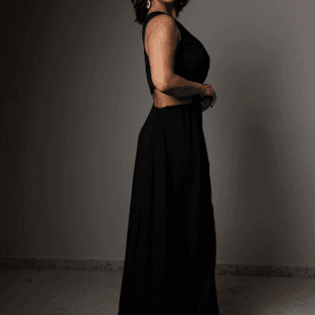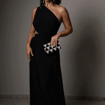 Feito com crepe preto de caimento leve e fluido, o modelo de um ombro só traduz elegância com simplicidade. A fenda frontal sutil alonga a silhueta, enquanto o corte limpo e o tecido sofisticado trazem movimento e conforto. Ideal para madrinhas e formandas que buscam um visual minimalista, moderno e atemporal.
