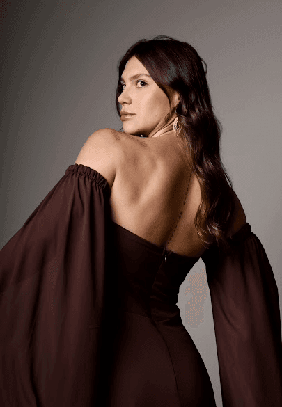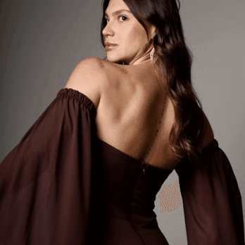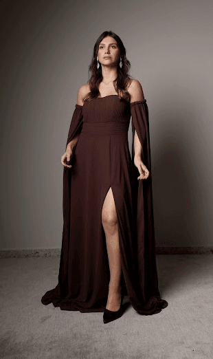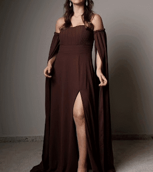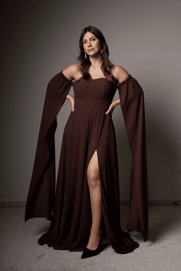 O Vestido Espresso une força e feminilidade em um design de presença. É feito em crepe com decote ombro a ombro, busto estruturado e mangas longas esvoaçantes que criam movimento e fluidez. A fenda frontal adiciona sensualidade sutil, enquanto o tom de marrom profundo reforça a sofisticação do visual. Ideal para madrinhas e convidadas que desejam um look moderno, elegante e atemporal.