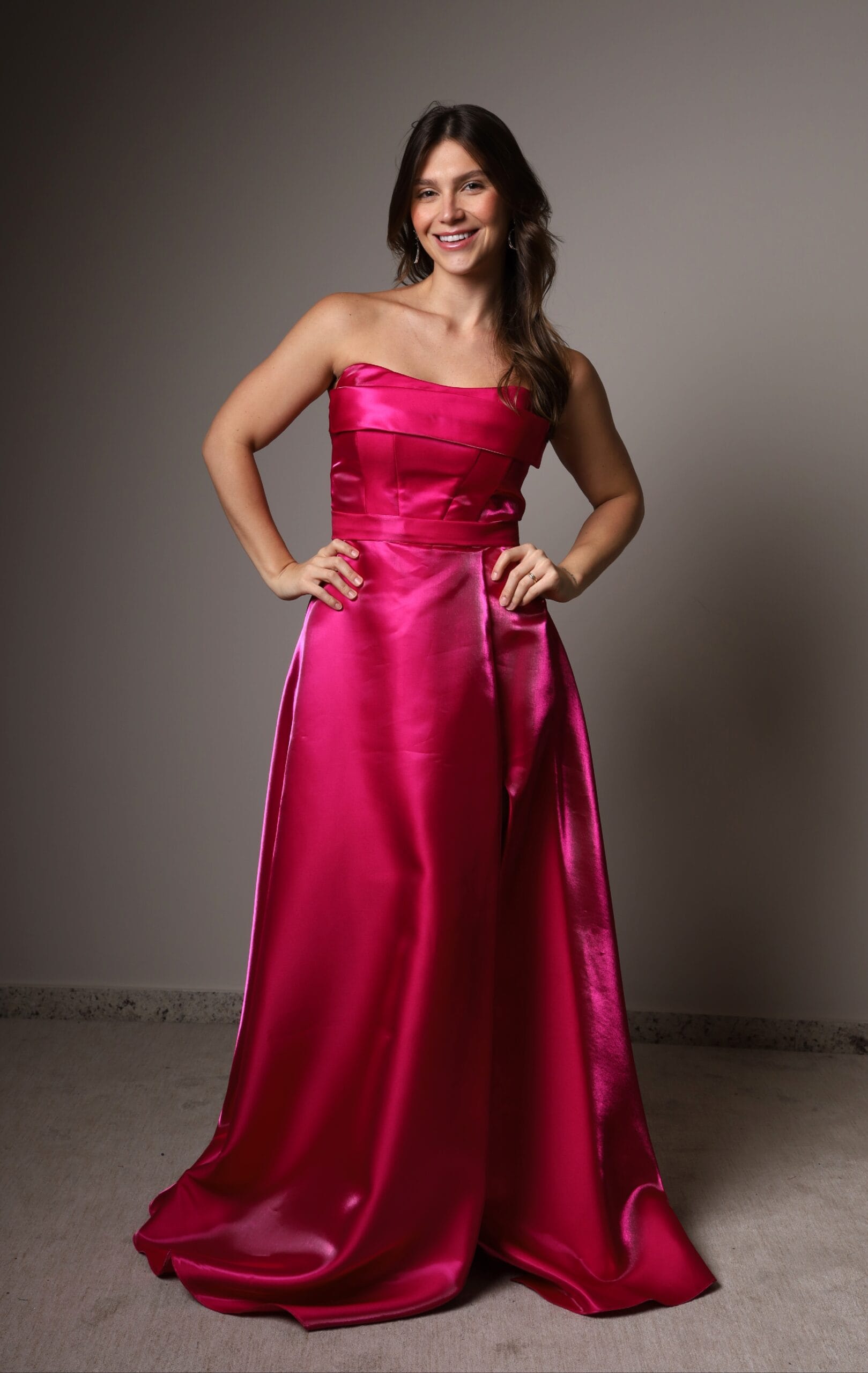 O Vestido Fiorella é puro encanto em versão contemporânea. Confeccionado em zibeline de brilho acetinado, tem estrutura impecável e modelagem tomara que caia que valoriza o colo com elegância. O tom pink intenso revela uma feminilidade vibrante, ideal para madrinhas, formandas e convidadas que desejam unir sofisticação e presença em um só look.