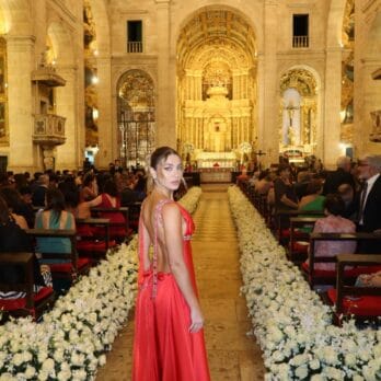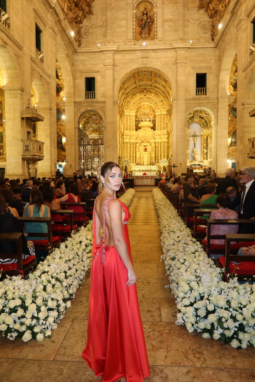 O decote profundo encontra o brilho preciso nos ombros e cintura, revelando o equilíbrio entre ousadia e sofisticação, e o laço vem para fechar com elegância.