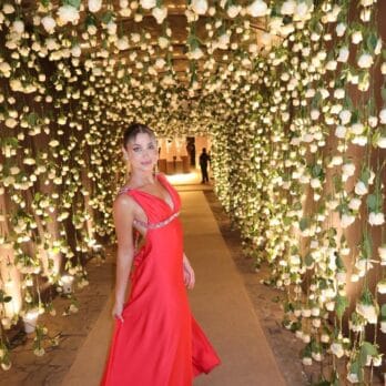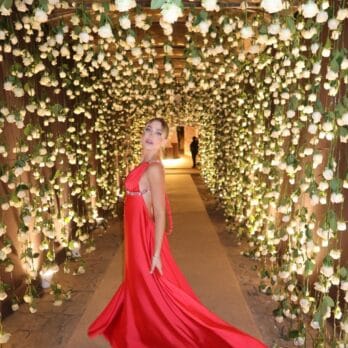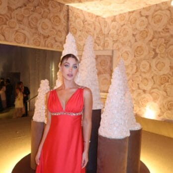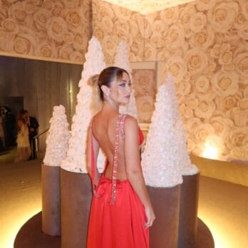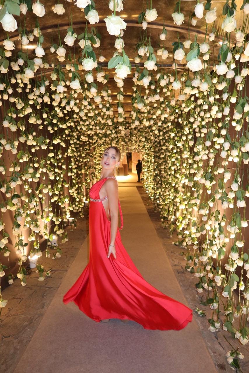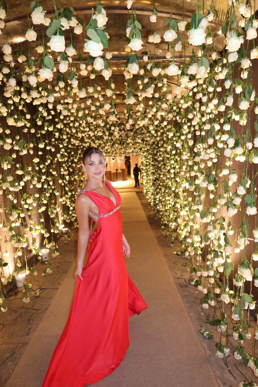 Feito em seda acetinada com acabamento em cristais, o Flamea combina fluidez e intensidade em uma silhueta que celebra o movimento.