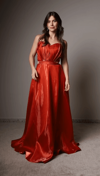 Feito com zibeline glow em tom terracota, o vestido Gisele traduz o equilíbrio entre estrutura e leveza. O corpete drapeado realça o busto com elegância, enquanto a saia ampla e fluida traz movimento e imponência. O brilho acetinado do tecido valoriza o tom quente e sofisticado, ideal para madrinhas, formandas e mães modernas que desejam um visual refinado e atemporal.