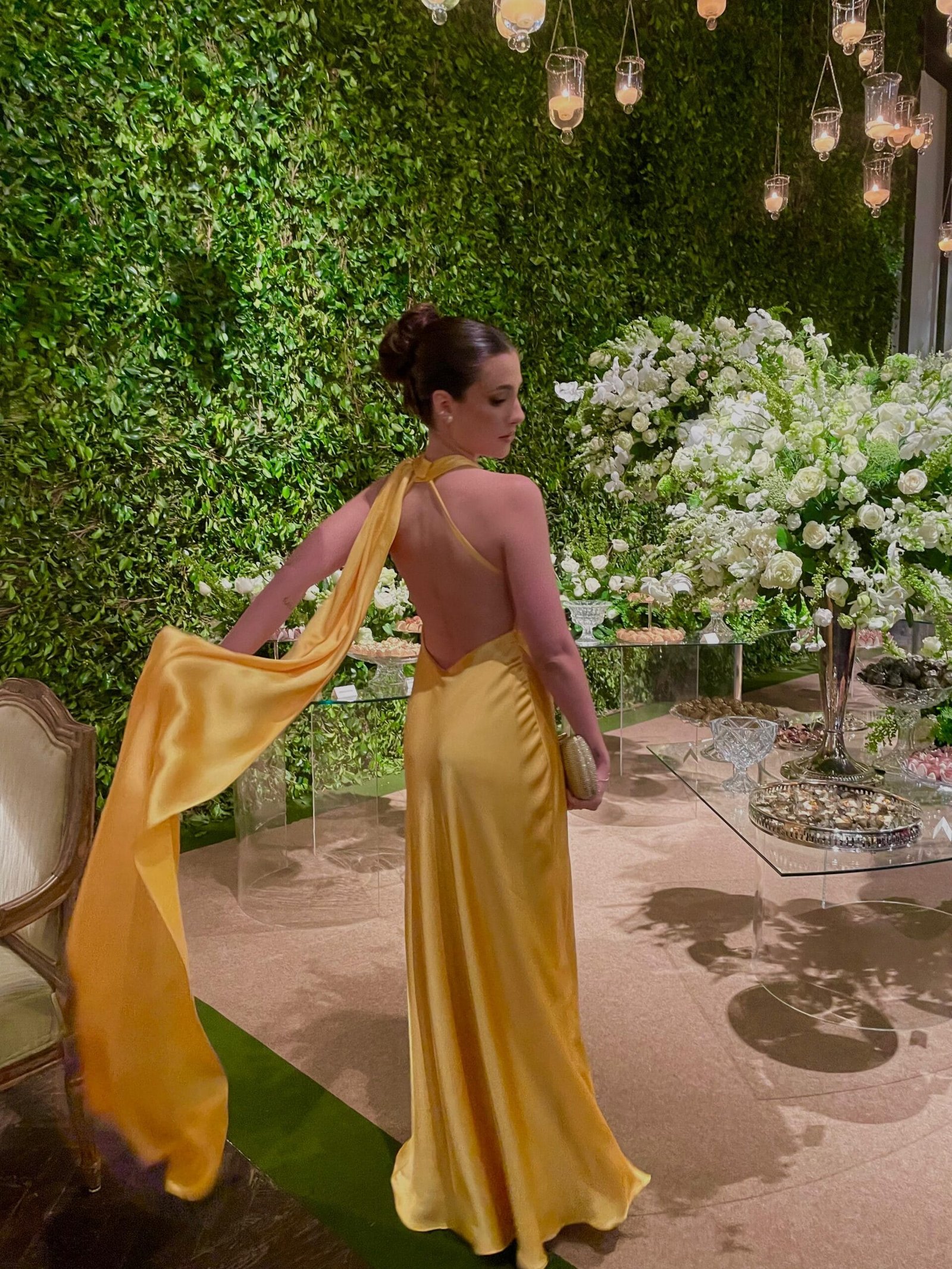 O Halo traz o encanto hipnótico da seda em tom amarelo dourado, criando uma peça que se move como luz. O desenho minimalista ganha intensidade com as costas totalmente abertas e a faixa longa que flutua atrás do corpo, formando um rastro luminoso a cada passo. Um modelo que celebra leveza, movimento e presença
