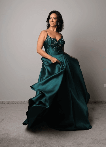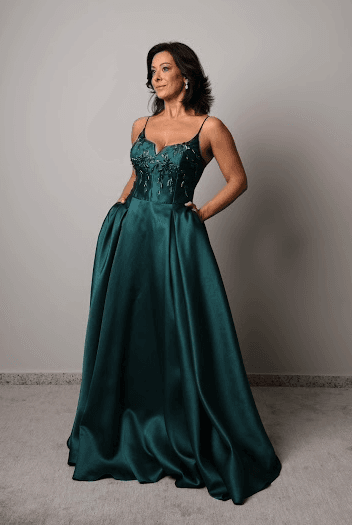 O vestido Helena é uma celebração do luxo atemporal. Confeccionado em zibeline verde profundo, traz estrutura impecável e brilho elegante. O corpete bordado em pedrarias realça o busto com delicadeza, enquanto a saia ampla com bolsos adiciona conforto e presença. O destaque fica por conta do laço nas costas, um detalhe marcante que confere um toque de romantismo e sofisticação à silhueta. Ideal para madrinhas, formandas ou convidadas de eventos de gala.