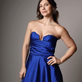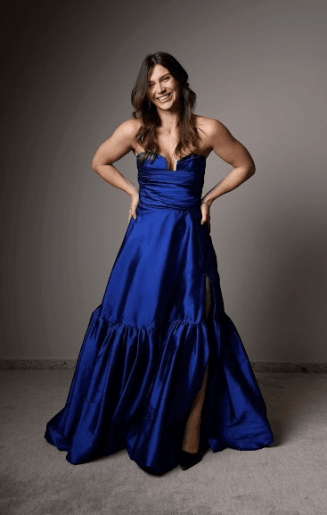 O Vestido Indigo traduz elegância e presença com seu tecido de tafetá em tom azul intenso. Feito com estrutura e brilho sutil, ele valoriza a silhueta com o corpo drapeado e a saia ampla com fenda frontal, criando um contraste equilibrado entre volume e leveza. Ideal para formandas e madrinhas que desejam um visual vibrante e imponente, sem abrir mão da sofisticação.