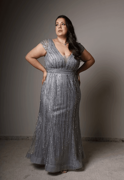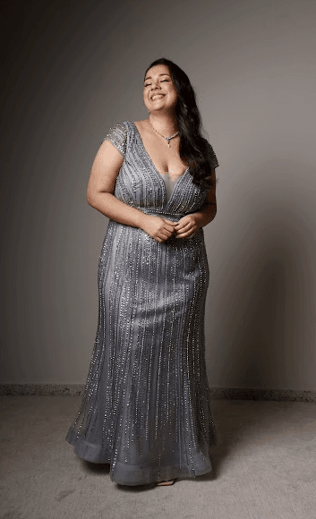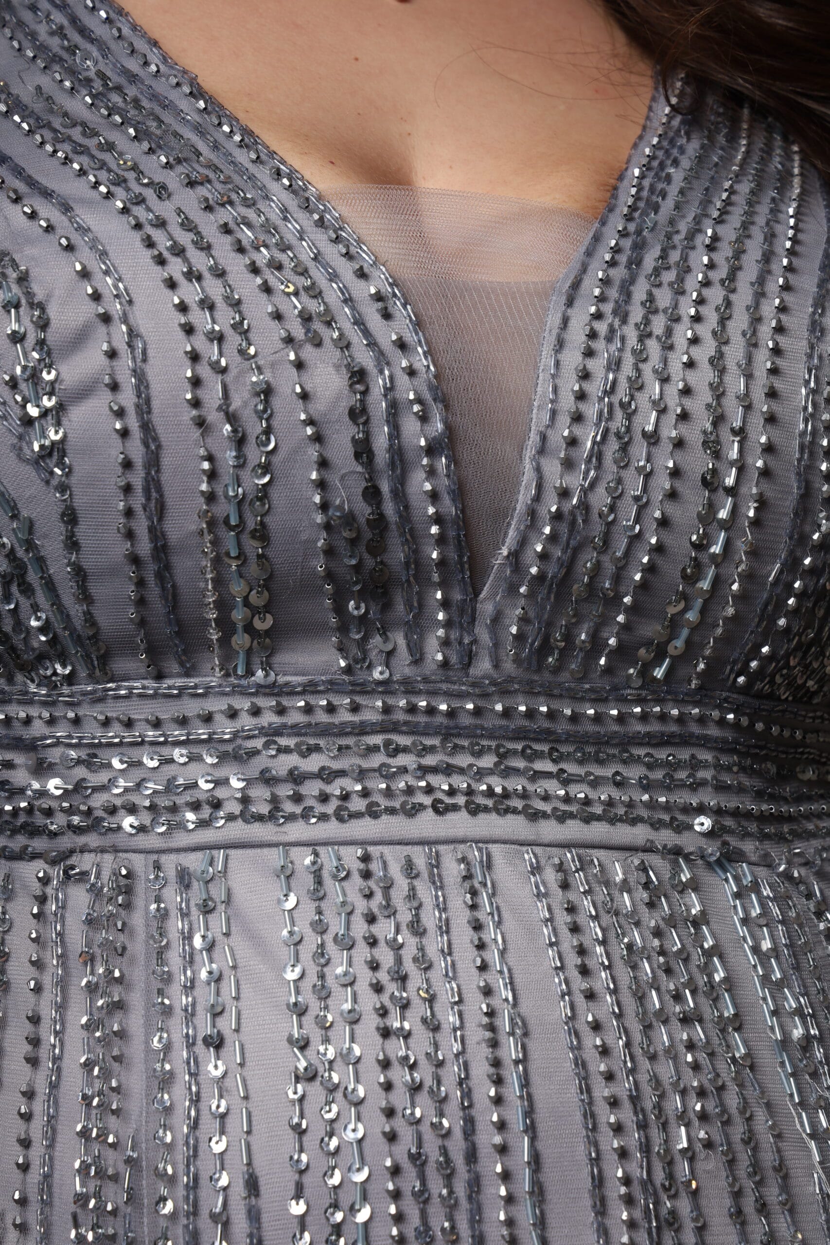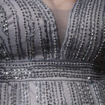 O Vestido Lumière Argentée é pura sofisticação em forma de brilho. Bordado em pedrarias que criam um desenho vertical elegante, o modelo alonga a silhueta e reflete a luz com delicadeza. Seu decote em V e as manguinhas curtas conferem um toque de feminilidade equilibrado ao glamour da peça. Ideal para quem busca um visual radiante e refinado em eventos noturnos.
