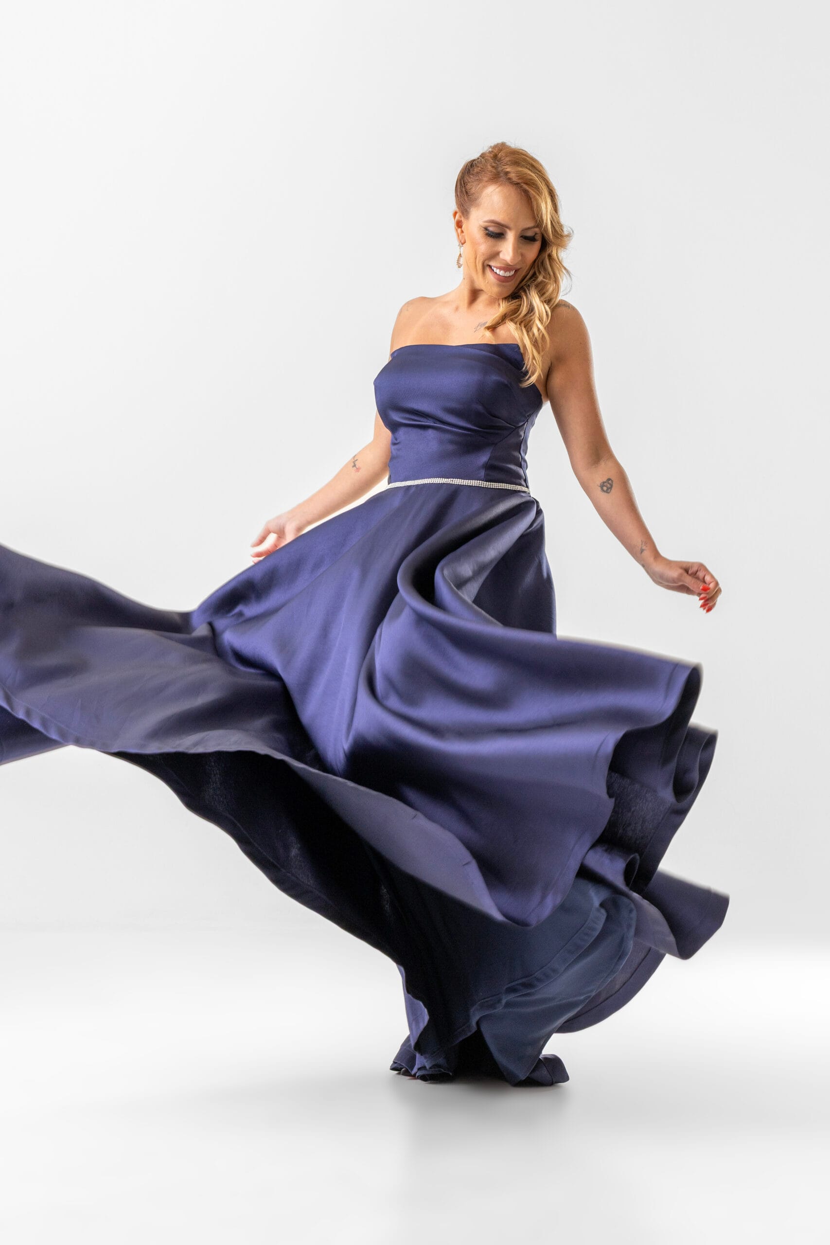 O Vestido Luna é feito em zibeline azul marinho, um tecido estruturado que garante presença e movimento impecável. O decote tomara que caia com dobra escultural cria um visual limpo e elegante, enquanto a saia ampla traz fluidez dramática . Perfeita para quem gosta de marcar presença com sofisticação. O detalhe delicado na cintura adiciona brilho sutil, iluminando a silhueta sem exageros. Ideal para madrinhas, formandas e eventos clássicos que pedem um toque de modernidade.