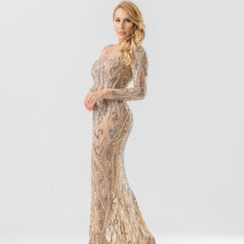 Um verdadeiro espetáculo de brilho e sofisticação. Este vestido nude em tela illusion foi bordado à mão com cristais Swarovski, criando um efeito luminoso que valoriza a silhueta feminina. O corte ajustado com fenda lateral traz sensualidade na medida certa, enquanto as mangas longas equilibram o visual, tornando-o perfeito para ocasiões de gala, casamentos ou premiações