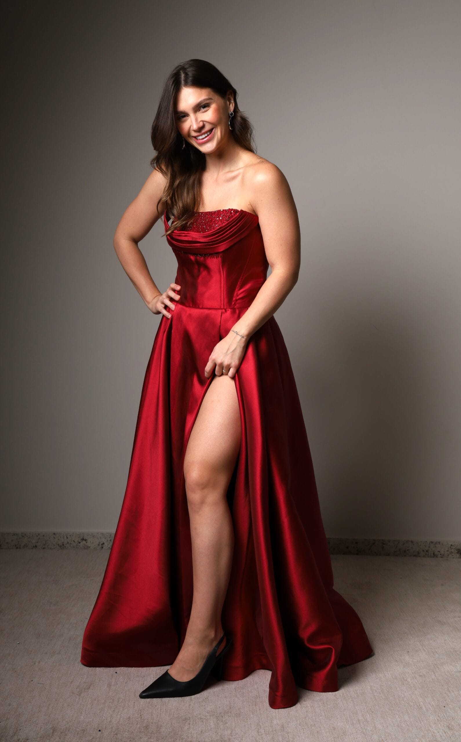 O Vestido Ofélia combina intensidade e requinte em uma criação de presença absoluta. Confeccionado em zibeline marsala, o modelo tomara que caia traz um delicado drapeado com bordado em cristais no busto, que realça o colo com brilho sutil e refinado. A fenda frontal acrescenta movimento e sensualidade à peça, equilibrando estrutura e leveza com maestria. Ideal para madrinhas, formandas e convidadas que desejam uma elegância marcante.