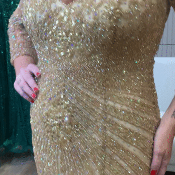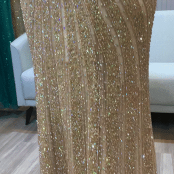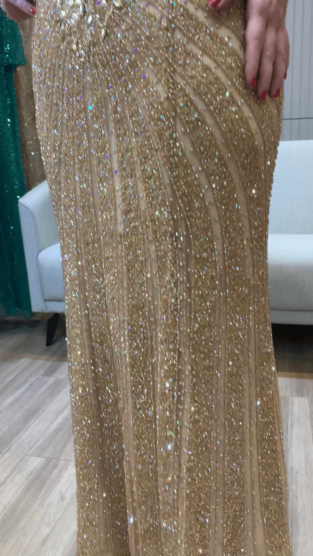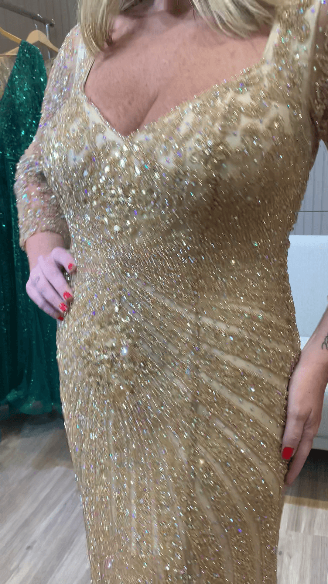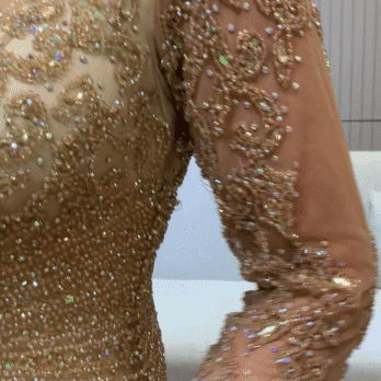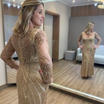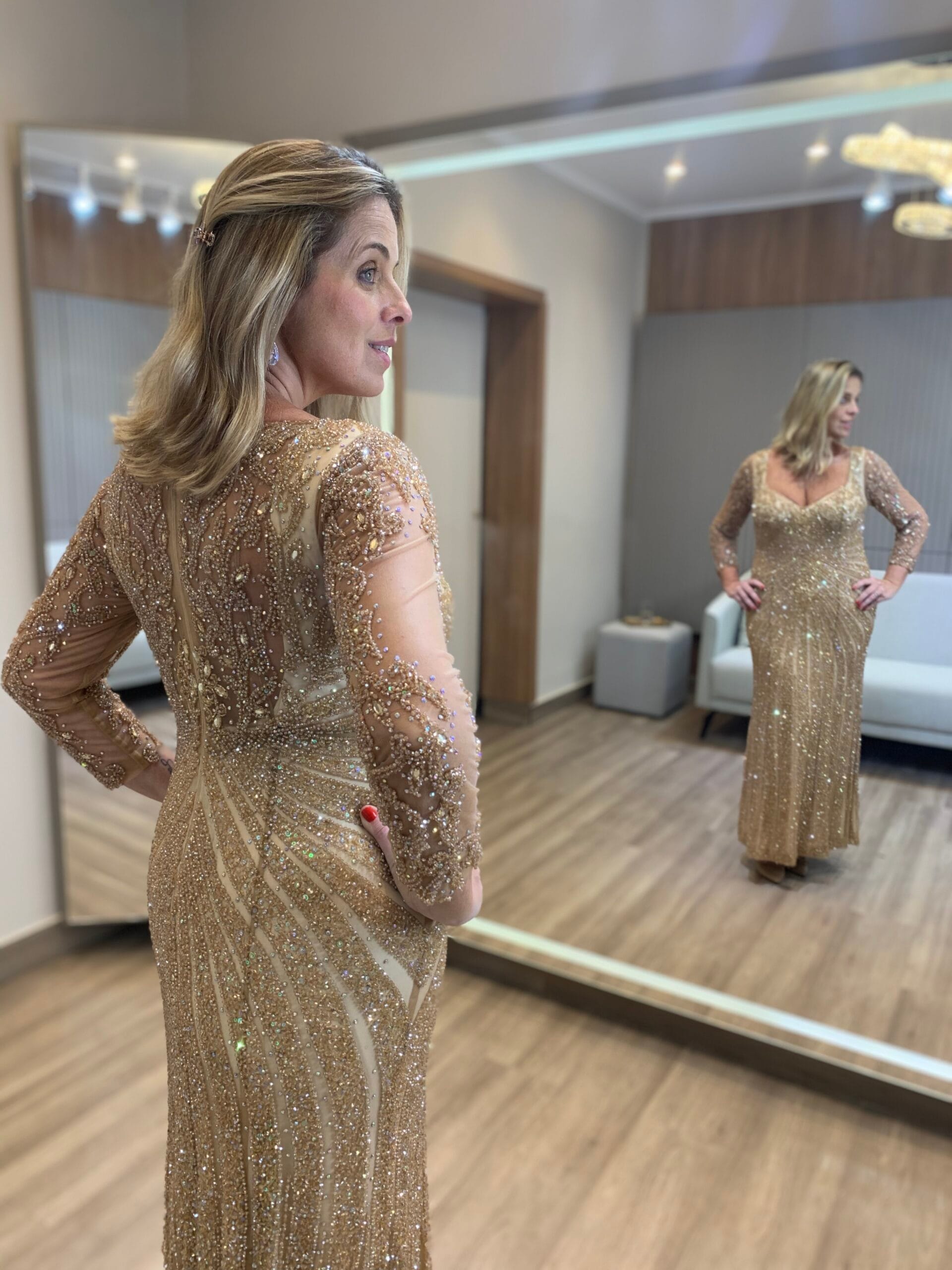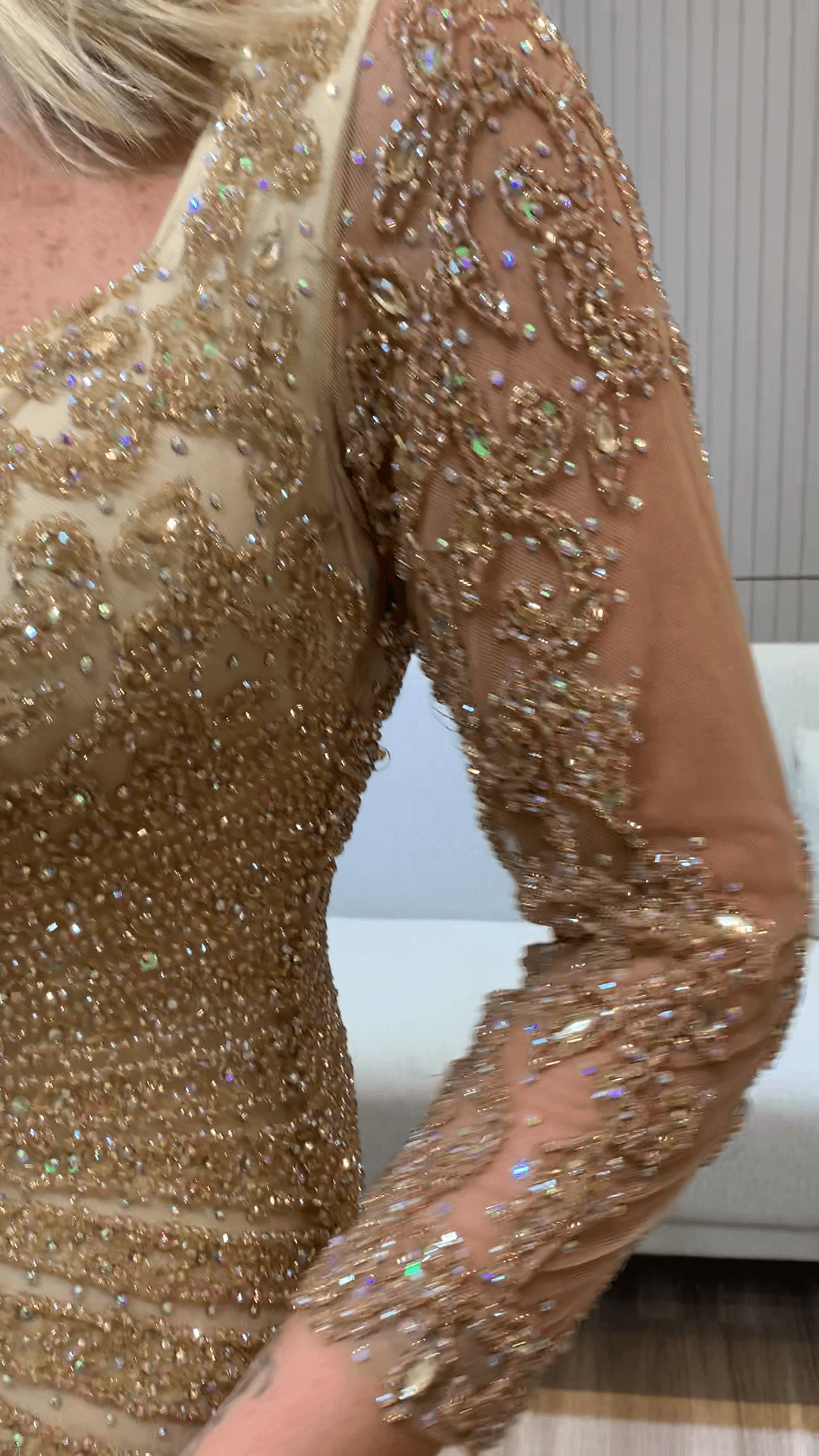 O dourado ganha vida neste vestido longo bordado em pedrarias que irradiam brilho em cada movimento. O tule transparente bordado em cristais e miçangas desenha a silhueta de forma impecável, criando um efeito luminoso e sofisticado. As mangas longas em tule bordado completam a elegância do modelo, que traduz luxo e imponência para momentos inesquecívei