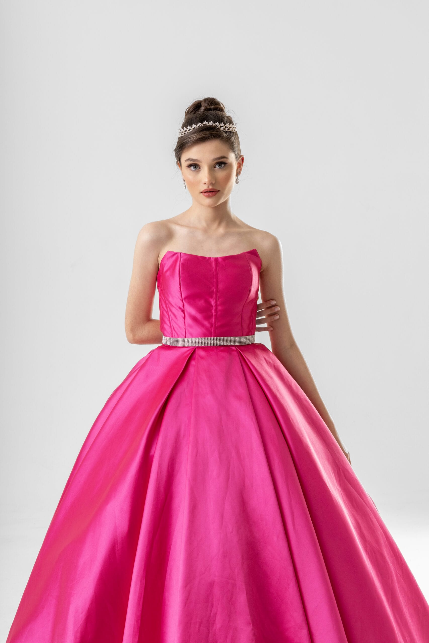 Um modelo atemporal em zibeline pink, com corpete liso tomara que caia e saia volumosa, ganha destaque pelo cinto bordado. Elegância e sofisticação nos detalhes sutis
