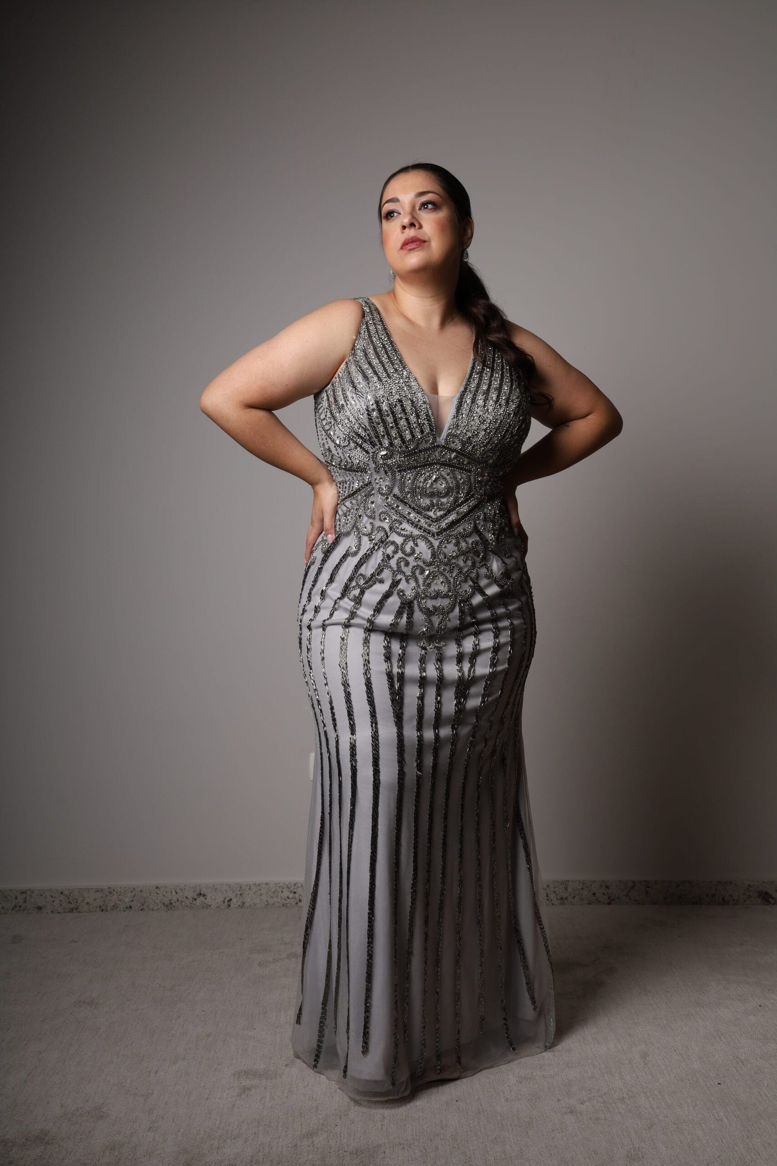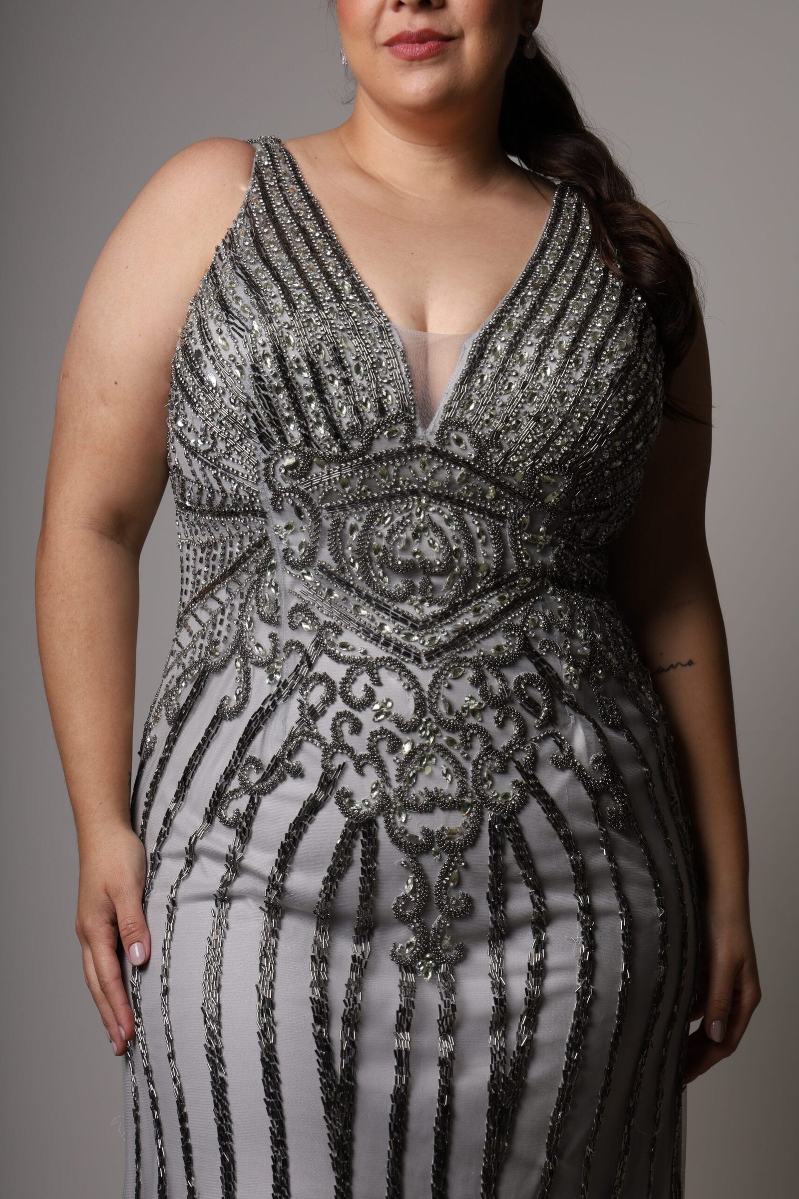 O Vestido Prata Luar é sinônimo de elegância atemporal. Bordado em pedrarias que formam um desenho geométrico hipnotizante, o modelo valoriza a silhueta com sofisticação e brilho na medida certa. O decote em V alonga o colo, enquanto a transparência sutil do tule adiciona leveza e um toque de mistério. Em tom prata luminoso, é a escolha ideal para madrinhas, formandas e convidadas que buscam um look refinado e marcante.