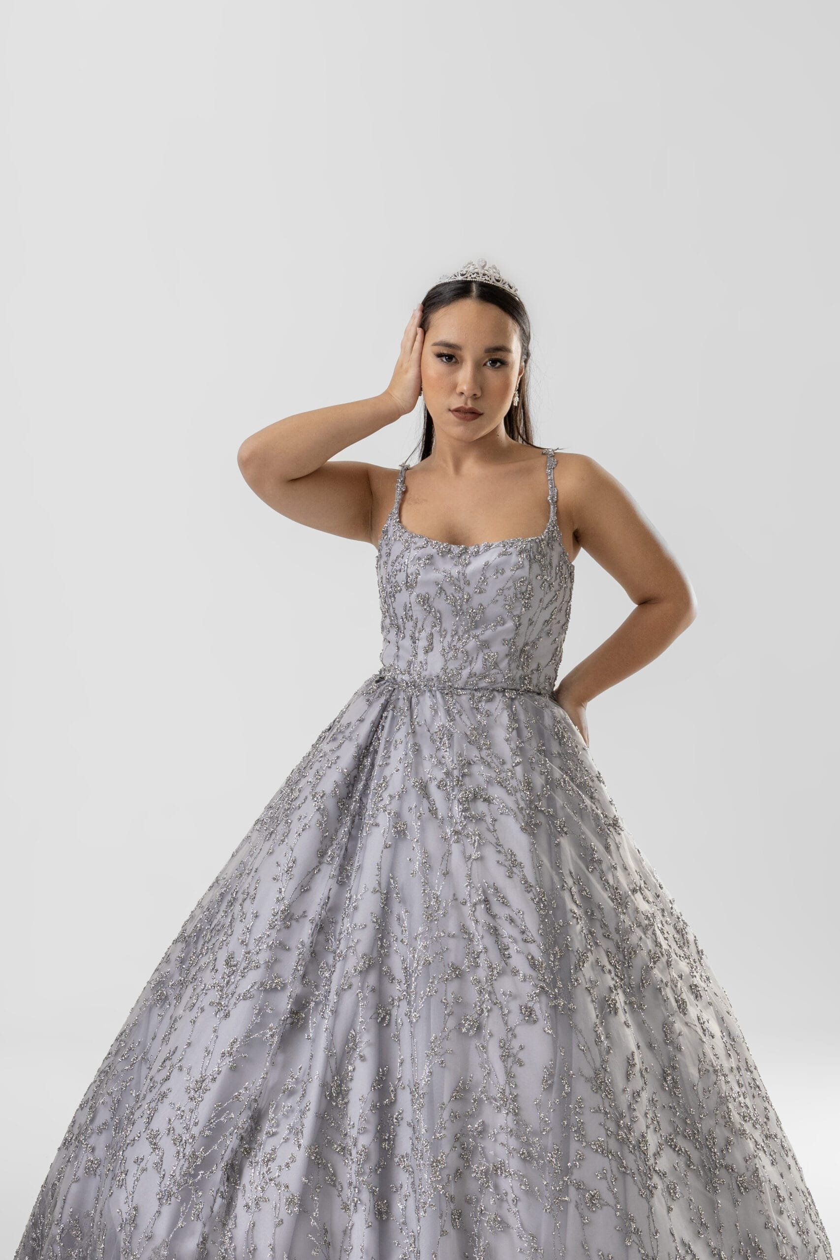 Com uma aura de sofisticação e delicadeza, este vestido prata é todo bordado em cristais que criam desenhos orgânicos por toda a peça. O decote suave com alças delicadas completa o visual de realeza, perfeito para a valsa da debutante que deseja transmitir classe e encanto.