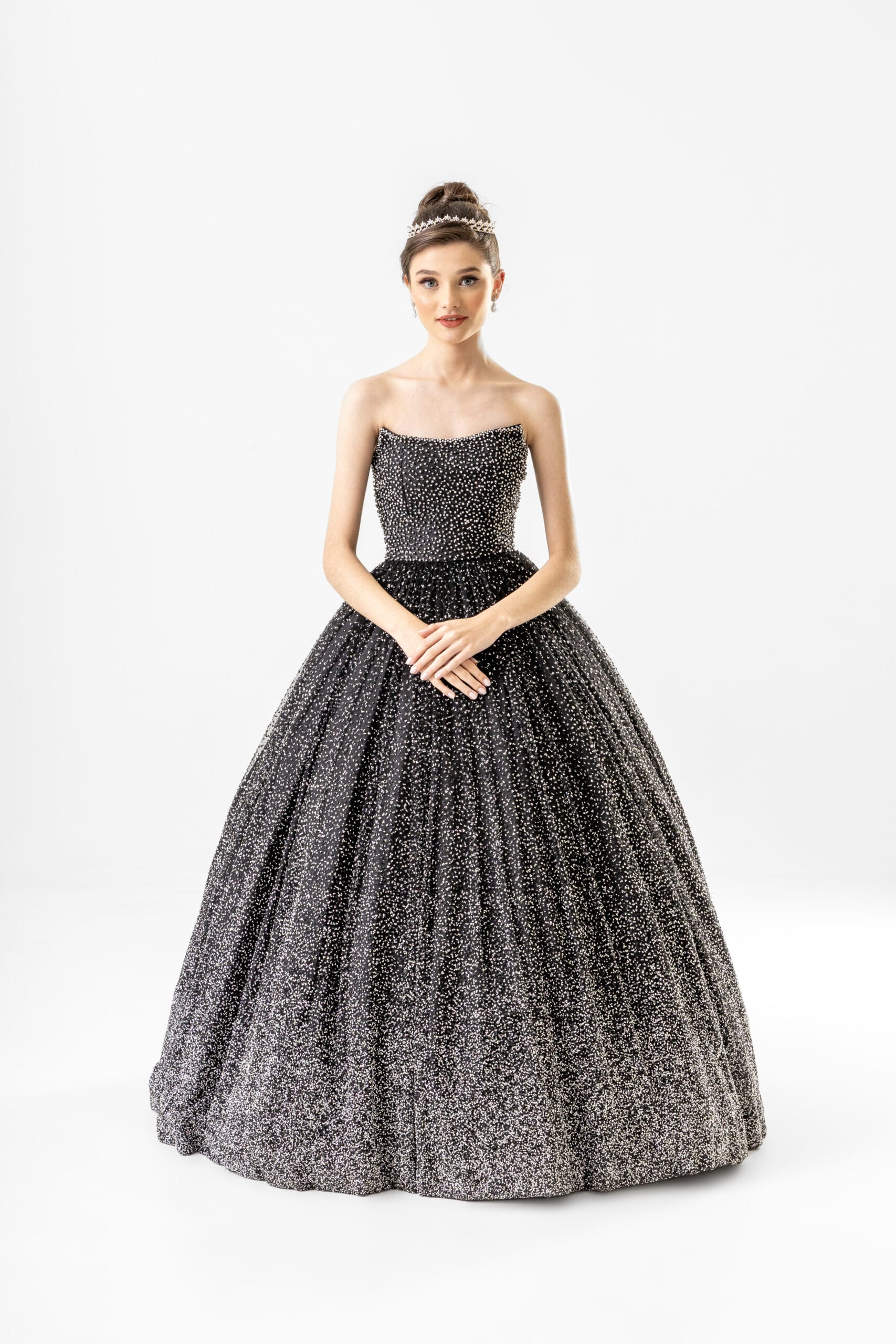 Com bordado em cristais que se espalham por todo o corpete e saia, este vestido preto transmite o efeito de um céu estrelado. A silhueta princesa garante imponência e romantismo, tornando-o ideal para debutantes que desejam brilhar com mistério e elegância