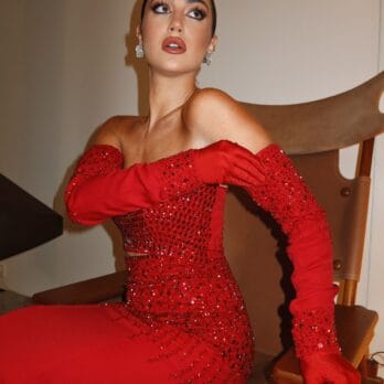 Bordado à mão com cristais escarlates, ele esculpe o corpo e captura a luz em cada movimento.