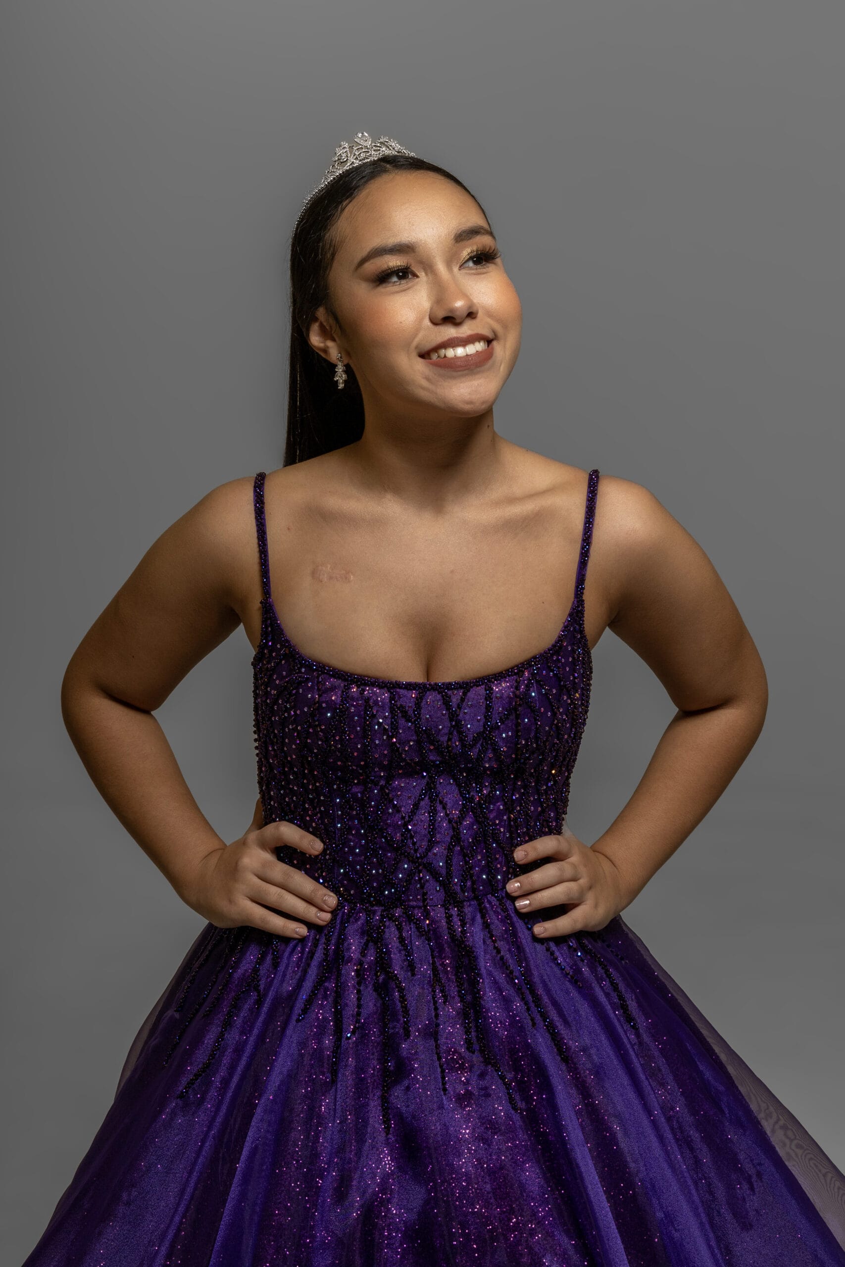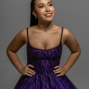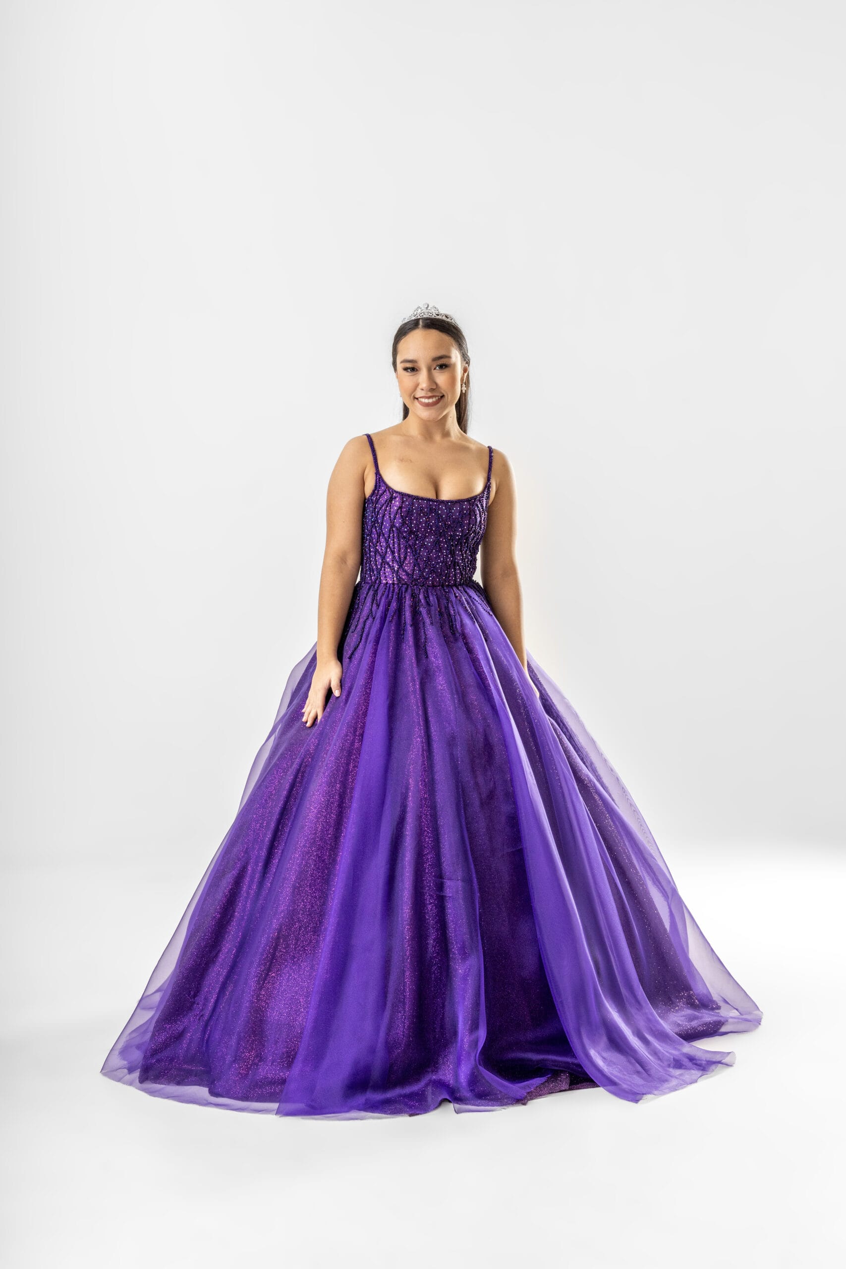 Em tom vibrante de roxo, este vestido possui corpete bordado em cristais Swarovski e saia godê ampl. O brilho intenso dos cristais aliado à tonalidade marcante transmite imponência e