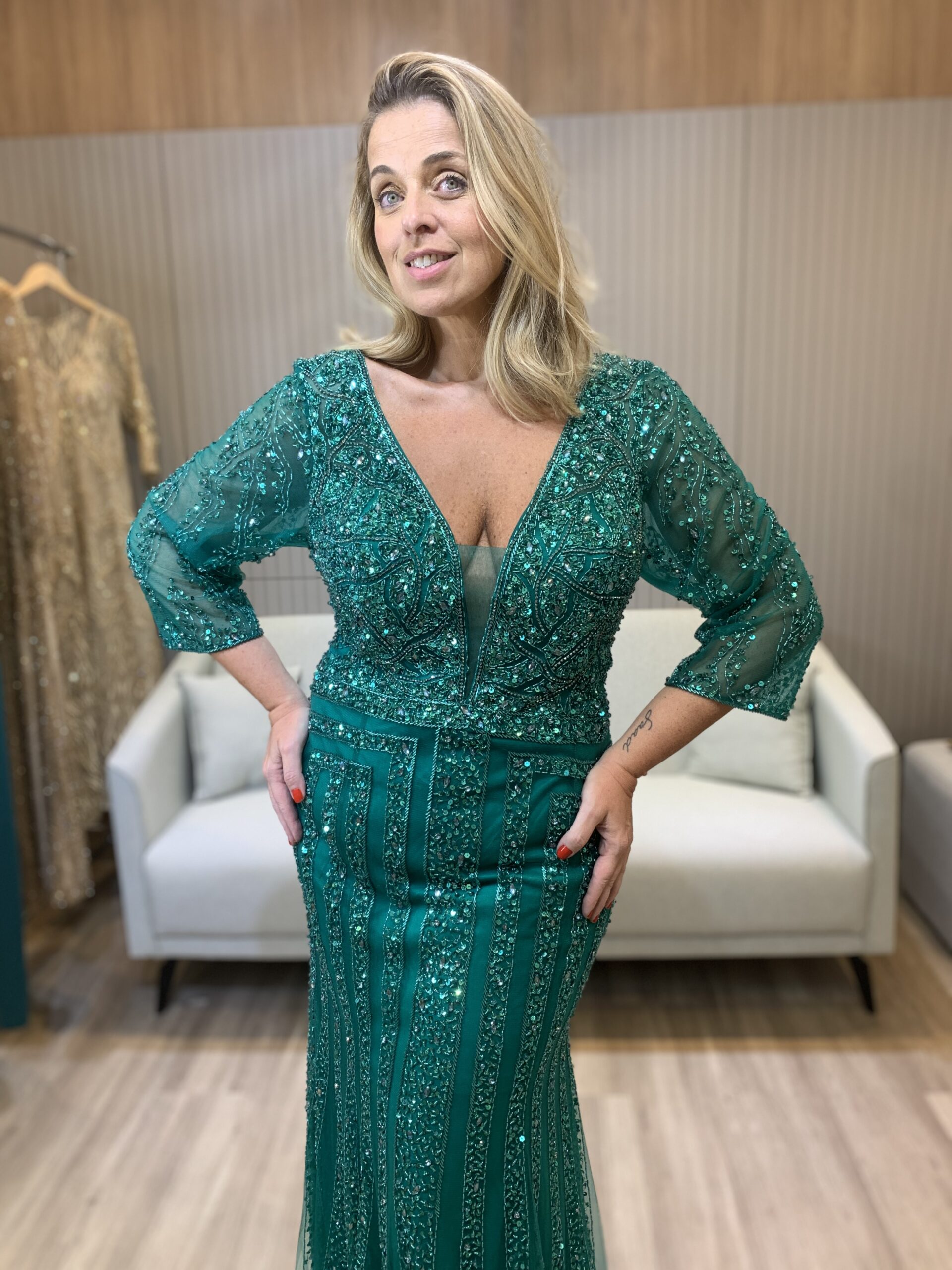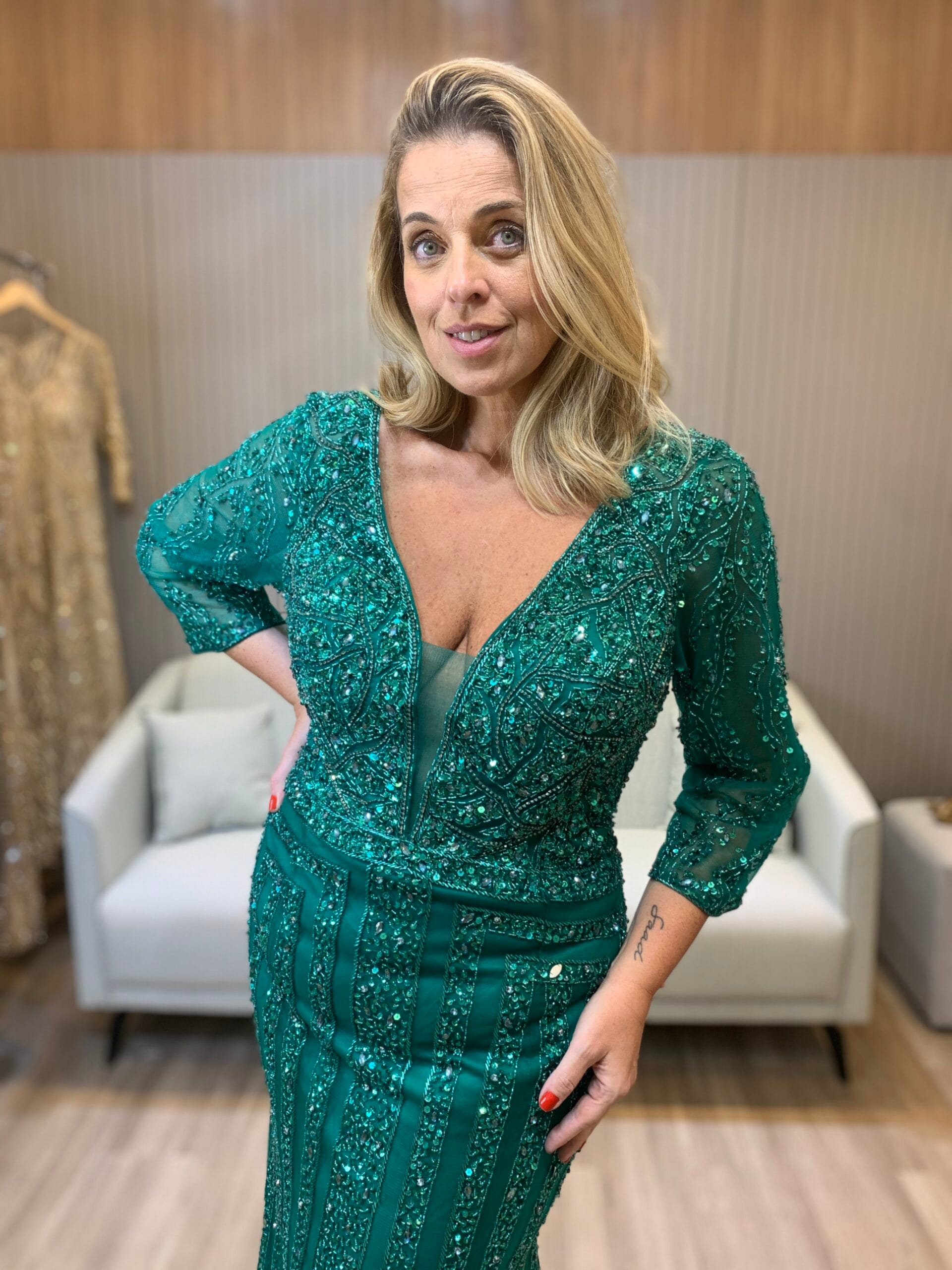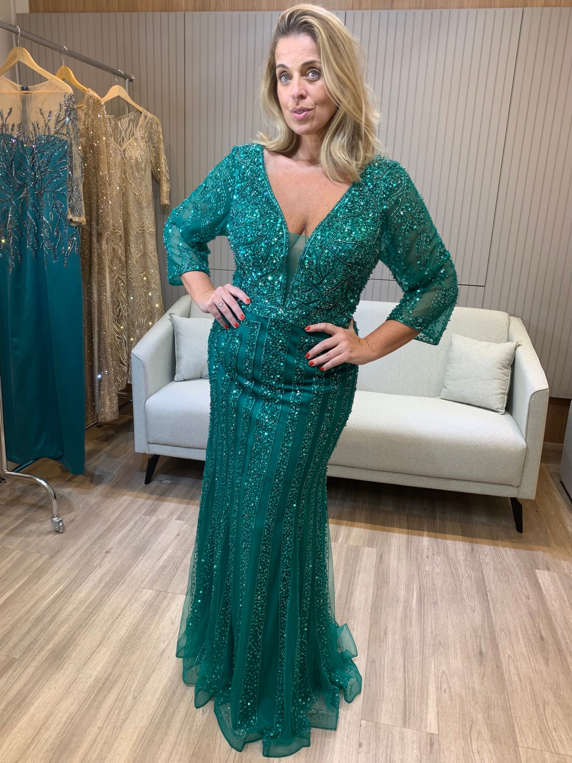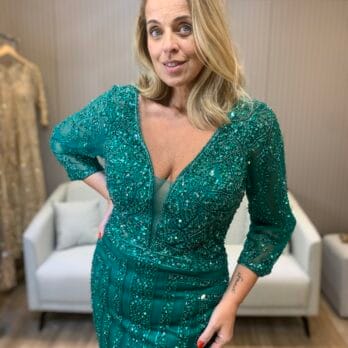 A intensidade do verde profundo se une ao brilho das pedrarias neste vestido longo bordado que é puro luxo. O decote em V valoriza o colo com elegância, enquanto as mangas em tule bordado completam o visual sofisticado.