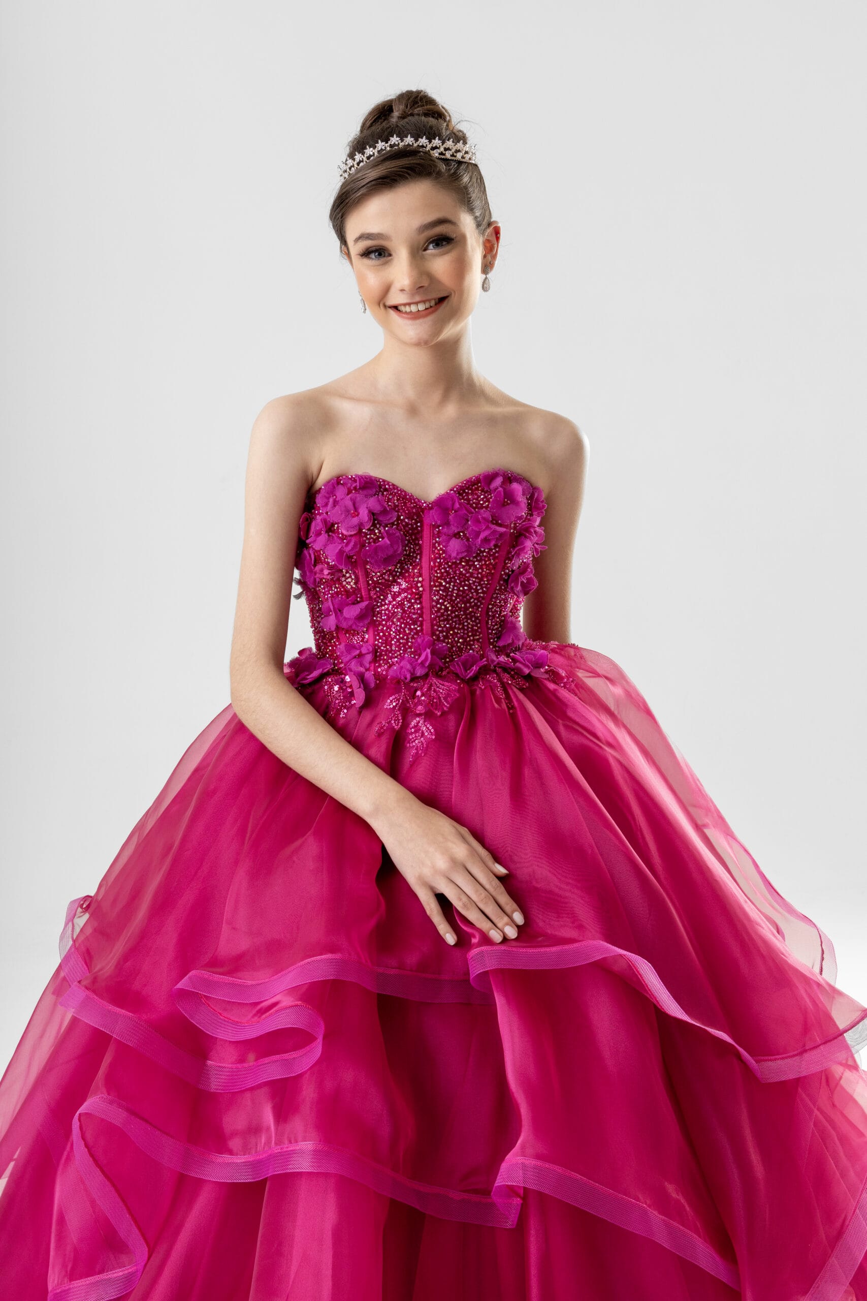 Este vestido fucsia é pura alegria! A saia volumosa garante leveza nos giros, enquanto o corpete bordado com flores e cristais Swarovski ilumina a produção com modernidade e charme