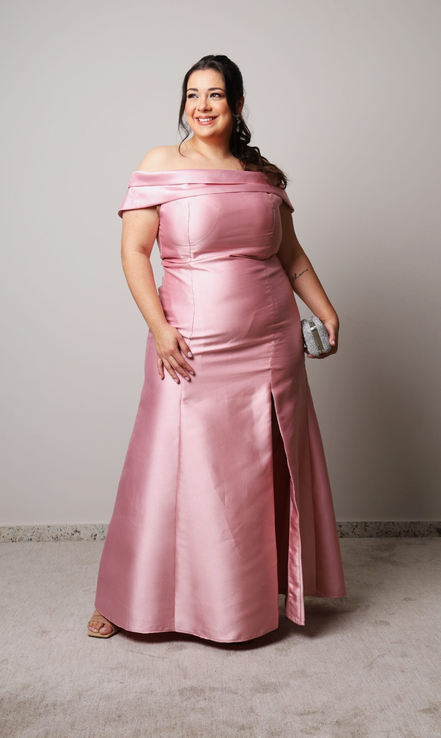 A zibeline rosé traz estrutura, sofisticação e um brilho sutil que valoriza a modelagem. O decote ombro a ombro emoldura o colo com elegância, enquanto o corpo bem construído acompanha a silhueta de forma segura e confortável. A saia longa com fenda discreta adiciona movimento e leveza ao visual, equilibrando presença e feminilidade. Um vestido marcante, ideal para convidadas e madrinhas que buscam elegância clássica com personalidade.