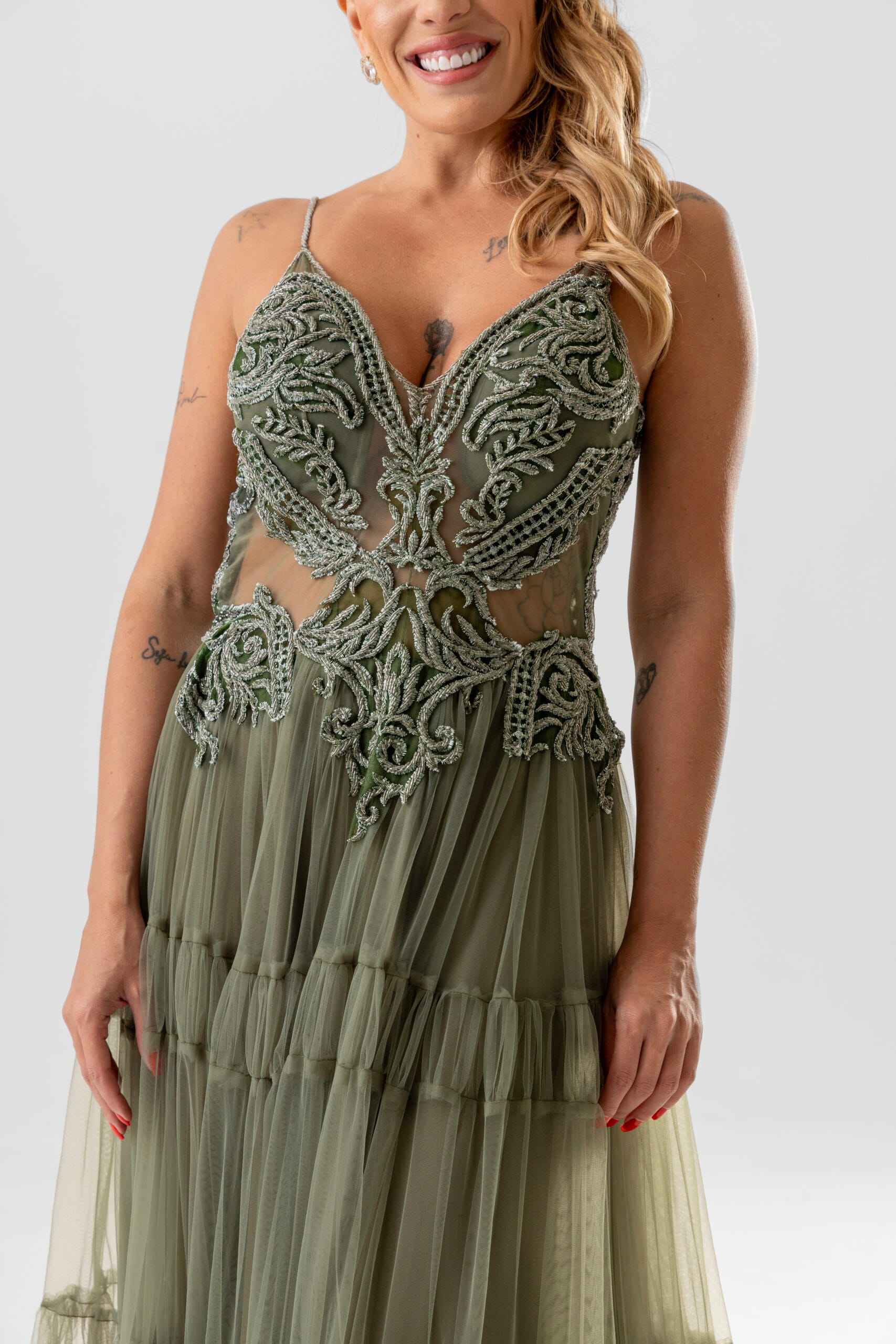 O Vestido Venezia é feito em tule leve com saia em camadas vaporosas, que criam um movimento suave e encantador. O corpo em renda bordada apresenta desenhos ornamentais ricos, com aplicações que trazem brilho e profundidade ao verde oliva. Os recortes laterais em transparência acrescentam modernidade e valorizam a silhueta com delicadeza. Um modelo que une romantismo e sofisticação