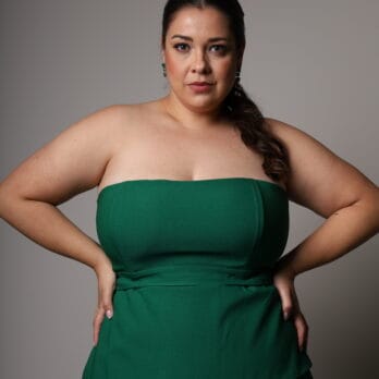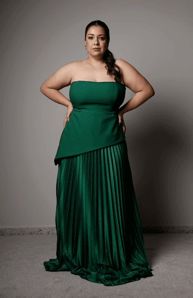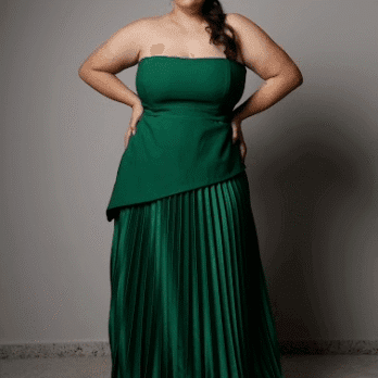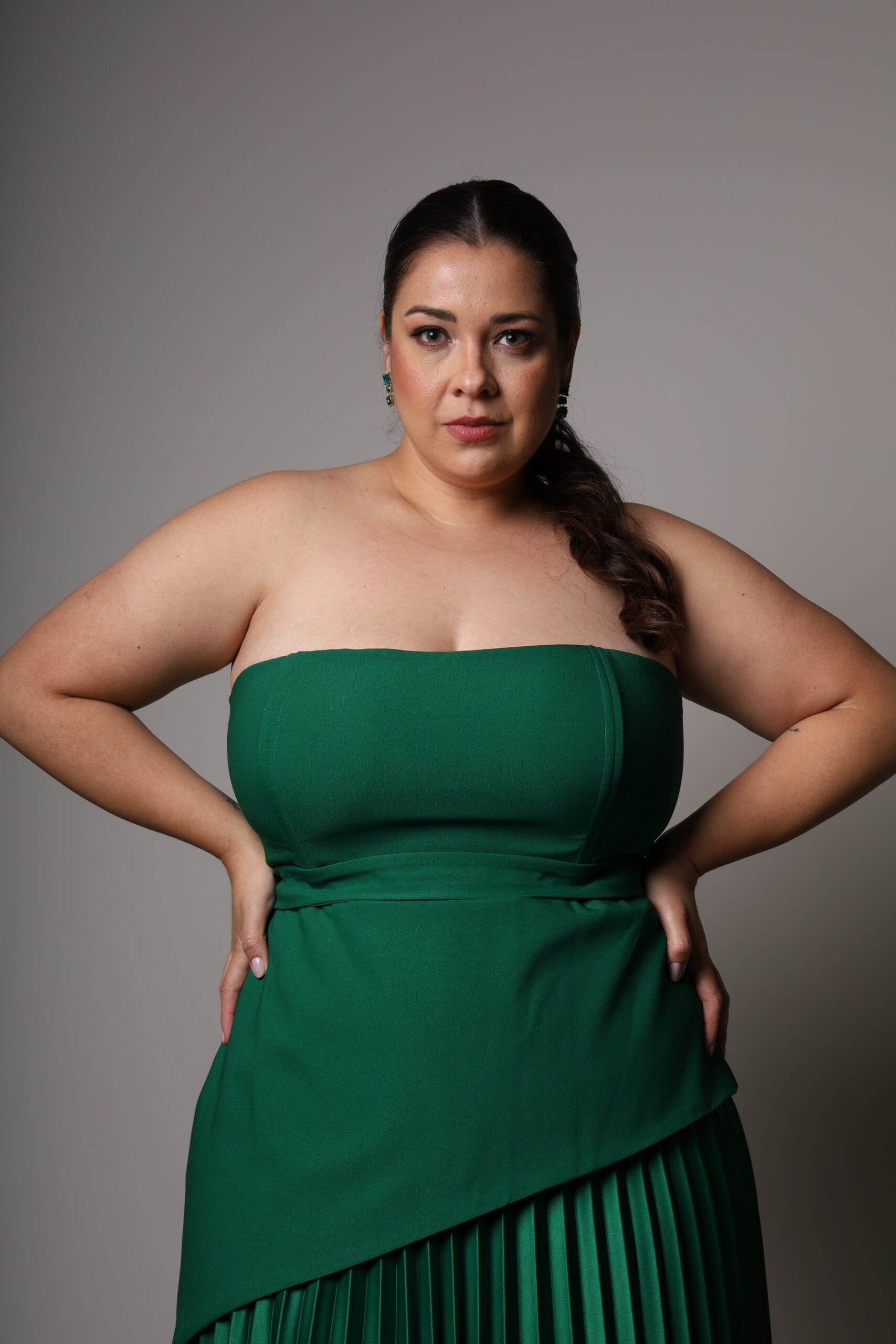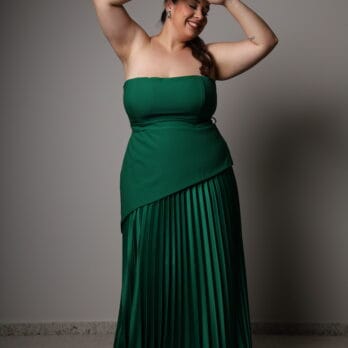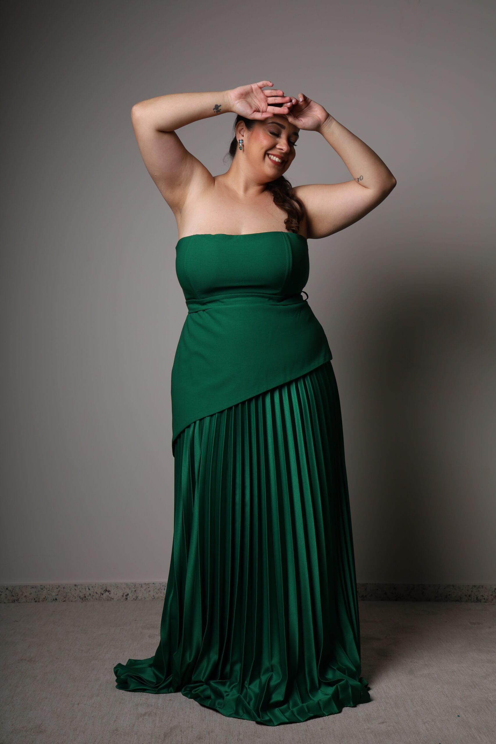 O Vestido Verde Esmeralda Orfeu combina estrutura e fluidez em uma silhueta de impacto. O busto tomara que caia, com corte reto e caimento preciso, realça o colo com elegância contemporânea. A sobreposição assimétrica na cintura traz um toque escultural, enquanto a saia plissada confere movimento e leveza ao visual. O tom esmeralda profundo traduz sofisticação e presença, perfeito para madrinhas e convidadas que desejam um look moderno e refinado.