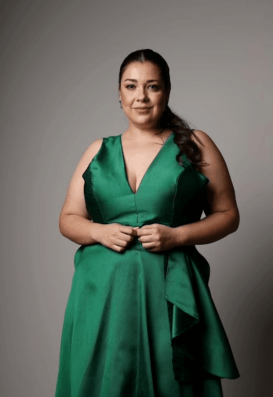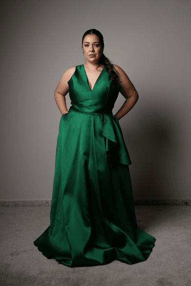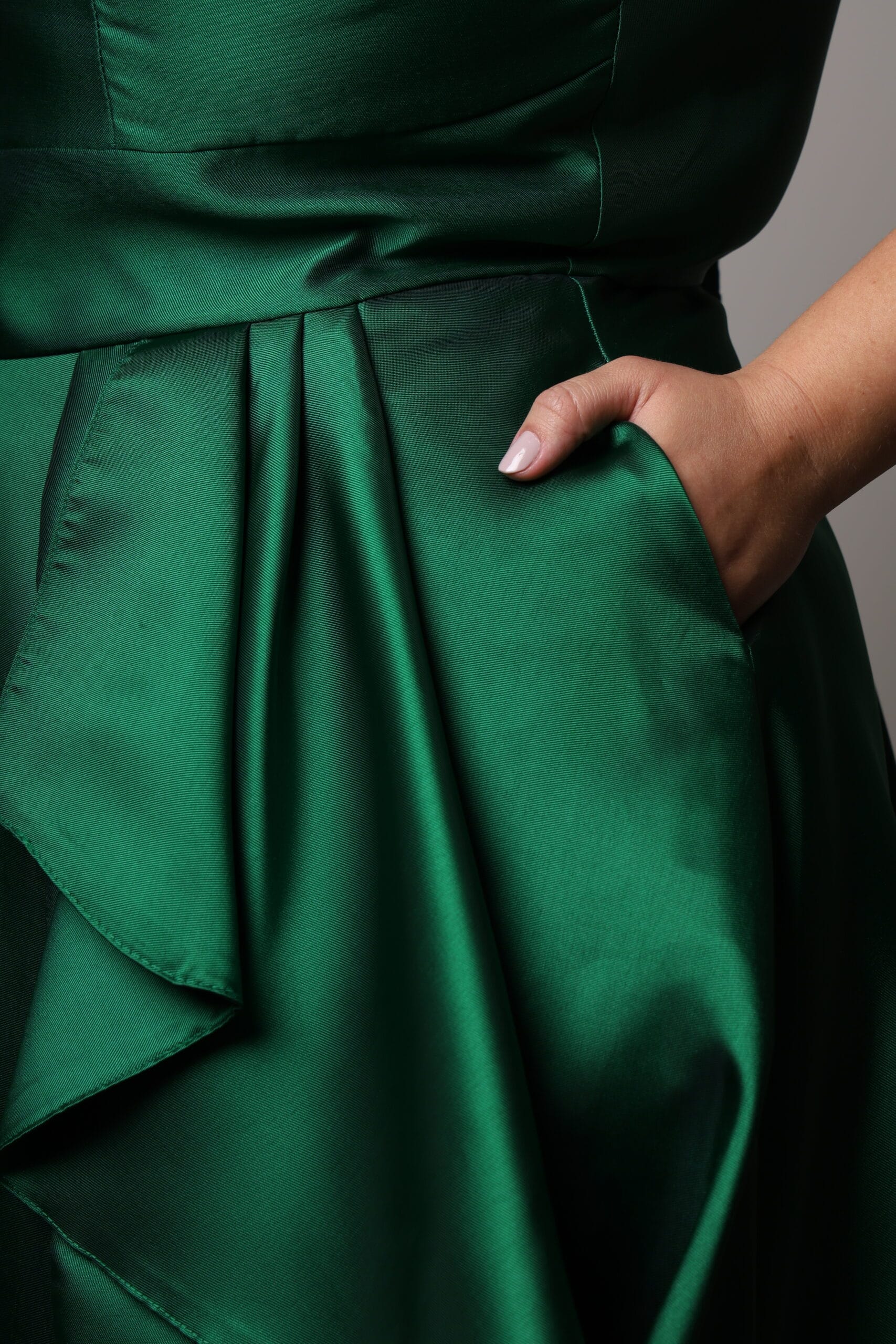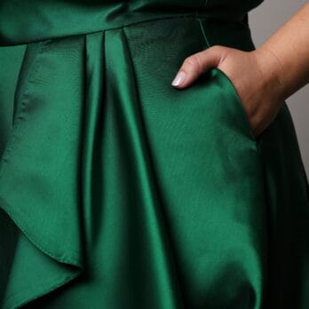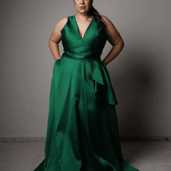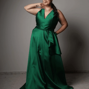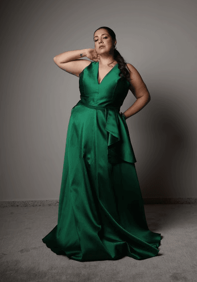 O Vestido Verde Majestade é sinônimo de elegância e imponência. Confeccionado em zibeline de caimento nobre, o modelo valoriza a silhueta com seu decote em “V” e a cintura marcada por um laço lateral estruturado. A saia ampla com volume controlado garante movimento e sofisticação. O tom de verde profundo transmite força e serenidade, ideal para madrinhas, formandas e eventos noturnos.