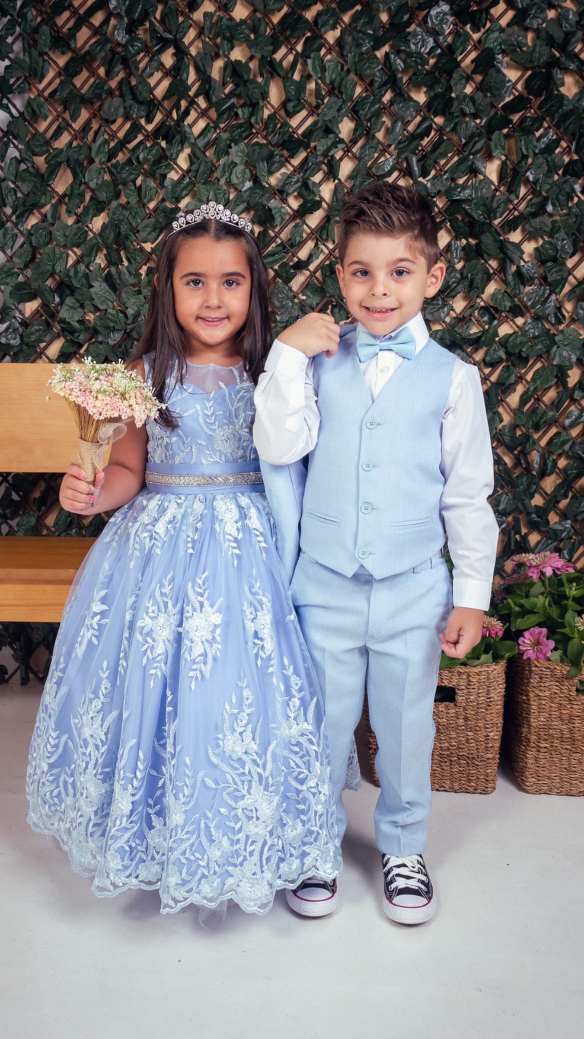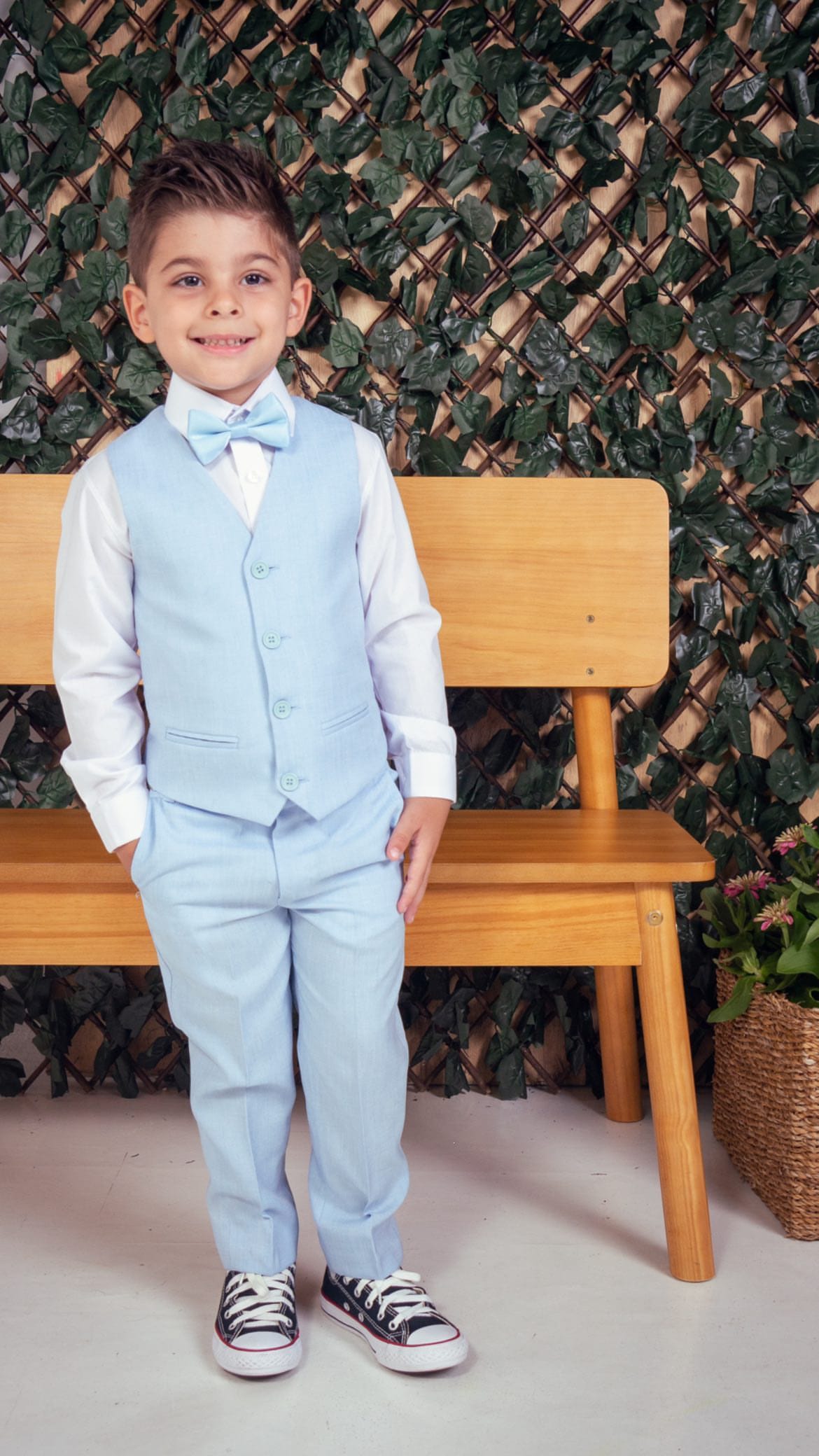 O Conjunto Lorenzo traduz o equilíbrio entre leveza e elegância. Feito em tecido de alfaiataria azul serenity, apresenta colete e calça combinados à camisa branca clássica e gravata borboleta no mesmo tom. Também disponível na versão com terno, é a escolha ideal para pajens e ocasiões especiais que pedem um toque de charme atemporal.