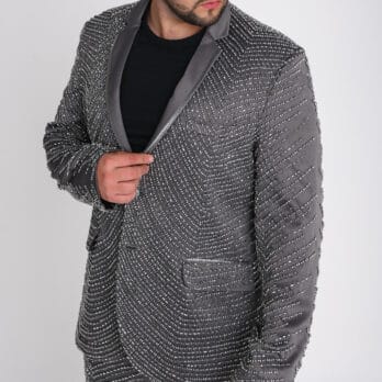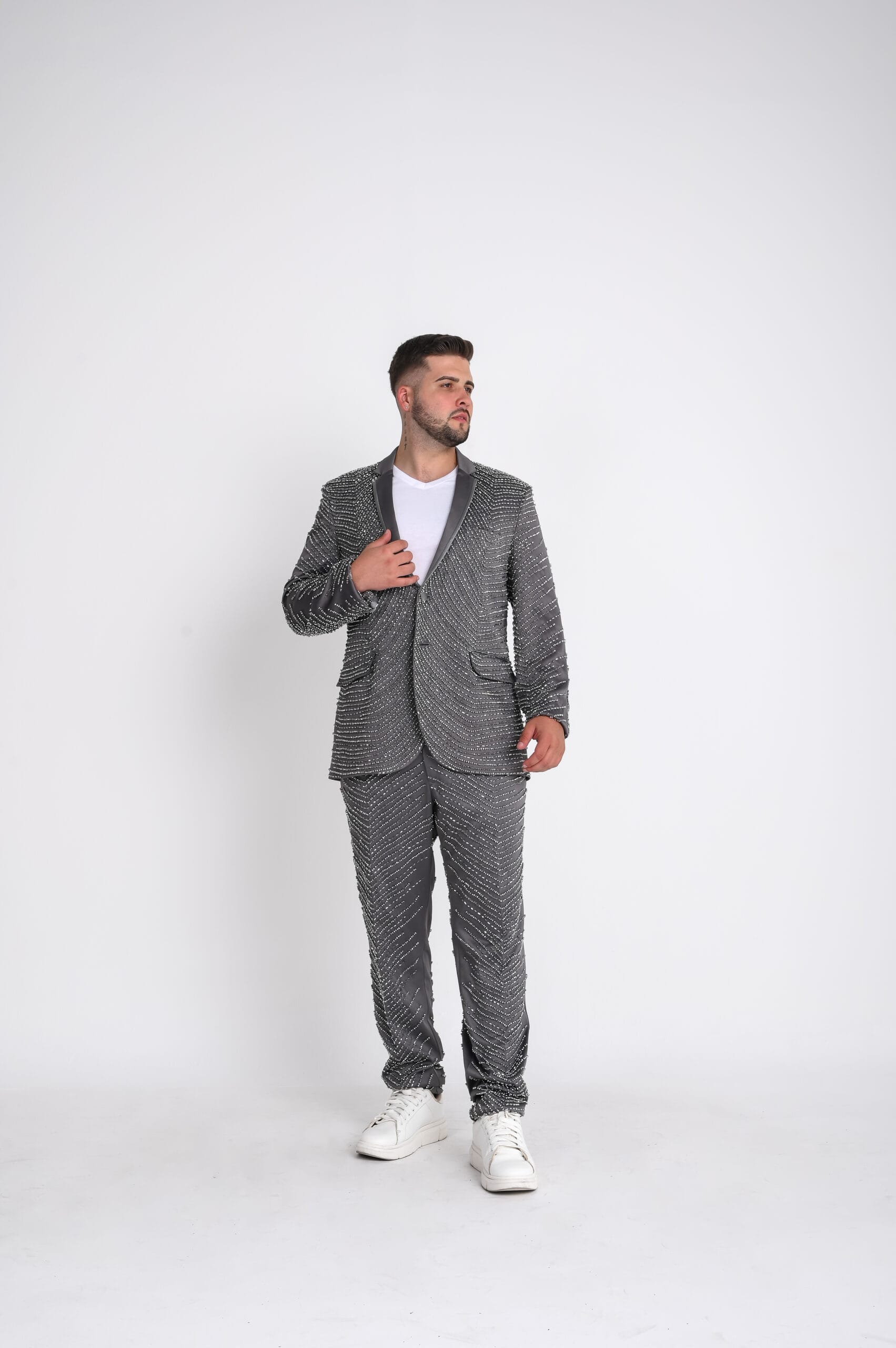 Terno slim cinza bordado com cristais e lapelas em cetim