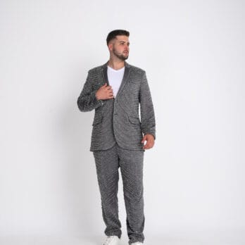 O Terno Slim Titanium traz uma leitura contemporânea da alfaiataria de gala. Feito em tecido cinza acetinado, ele se destaca pelo bordado geométrico de pedrarias prateadas, que cria um efeito metálico e tridimensional sobre a superfície. As lapelas em cetim completam o visual com contraste sutil e refinado. O resultado é um terno que combina força e sofisticação, ideal para eventos noturnos, premiações e momentos em que a presença precisa brilhar