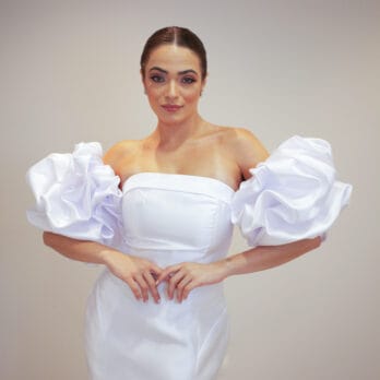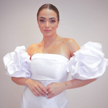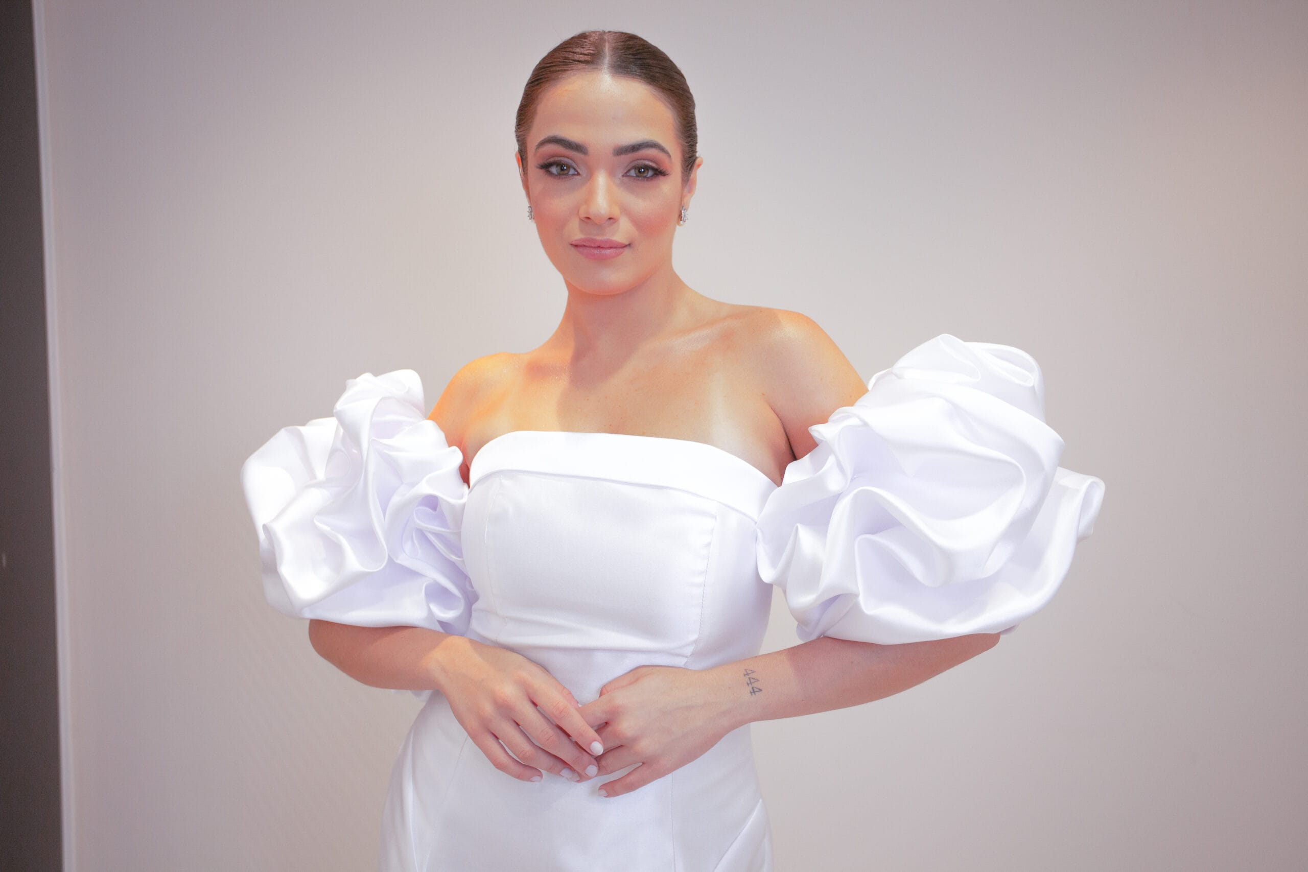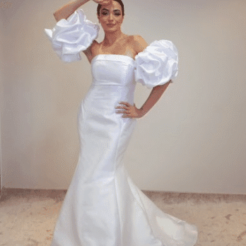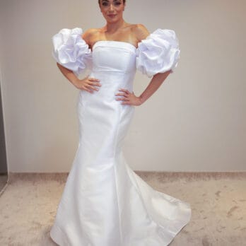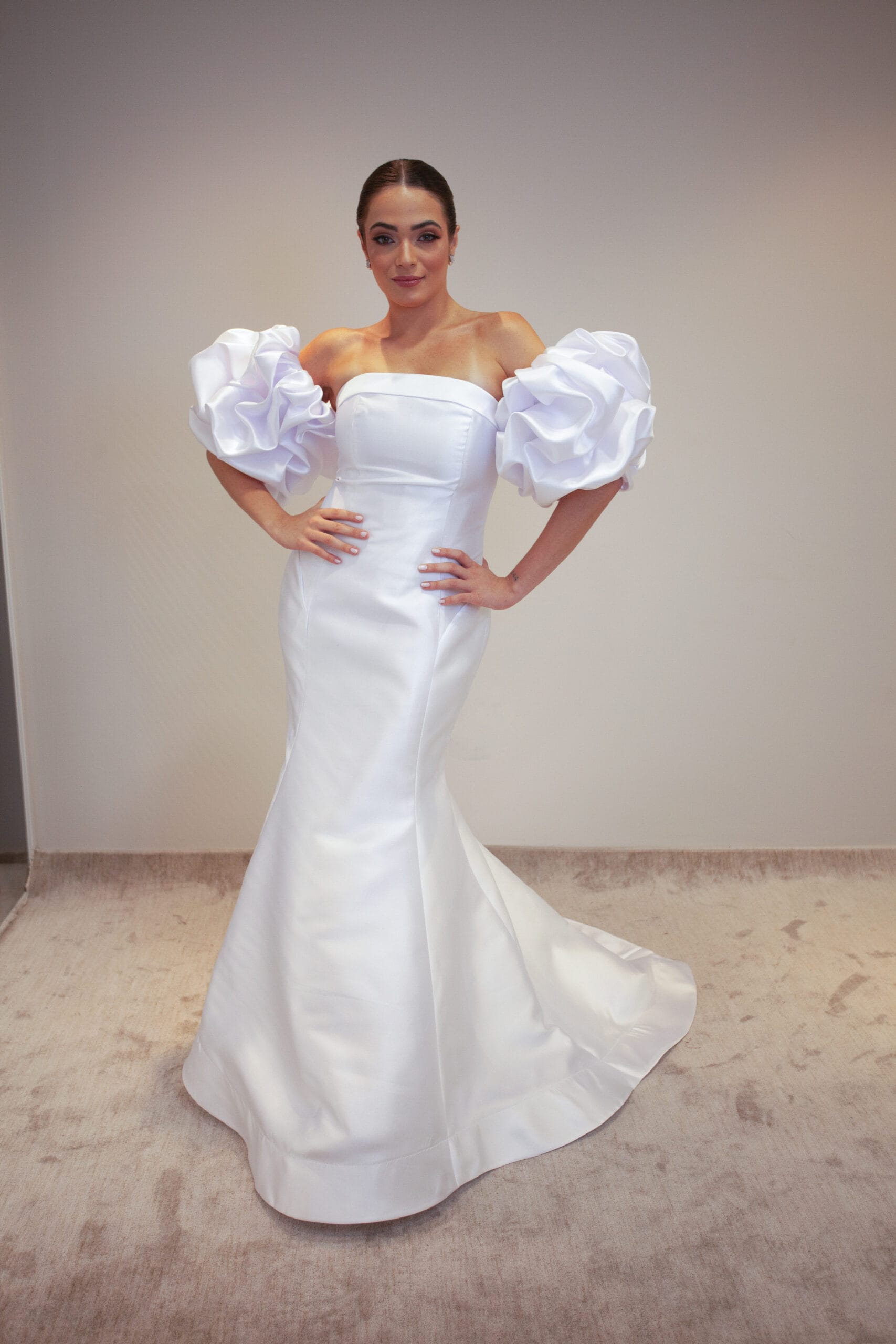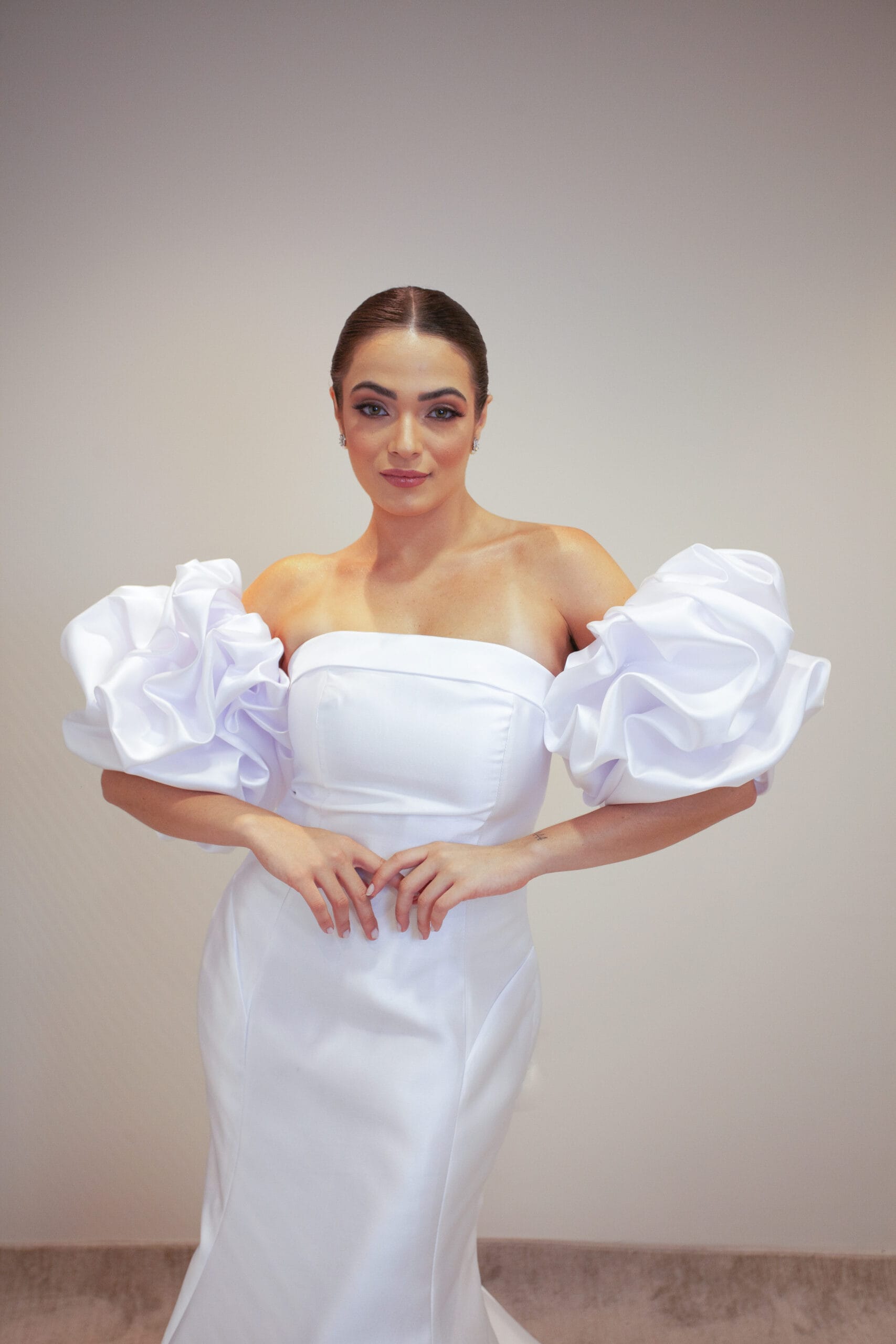 A nobreza da zibeline se une ao design contemporâneo neste vestido de noiva em corte sereia. O corpo minimalista realça a silhueta com elegância atemporal, enquanto as mangas em flores 3D trazem ousadia e romantismo em forma de arte.