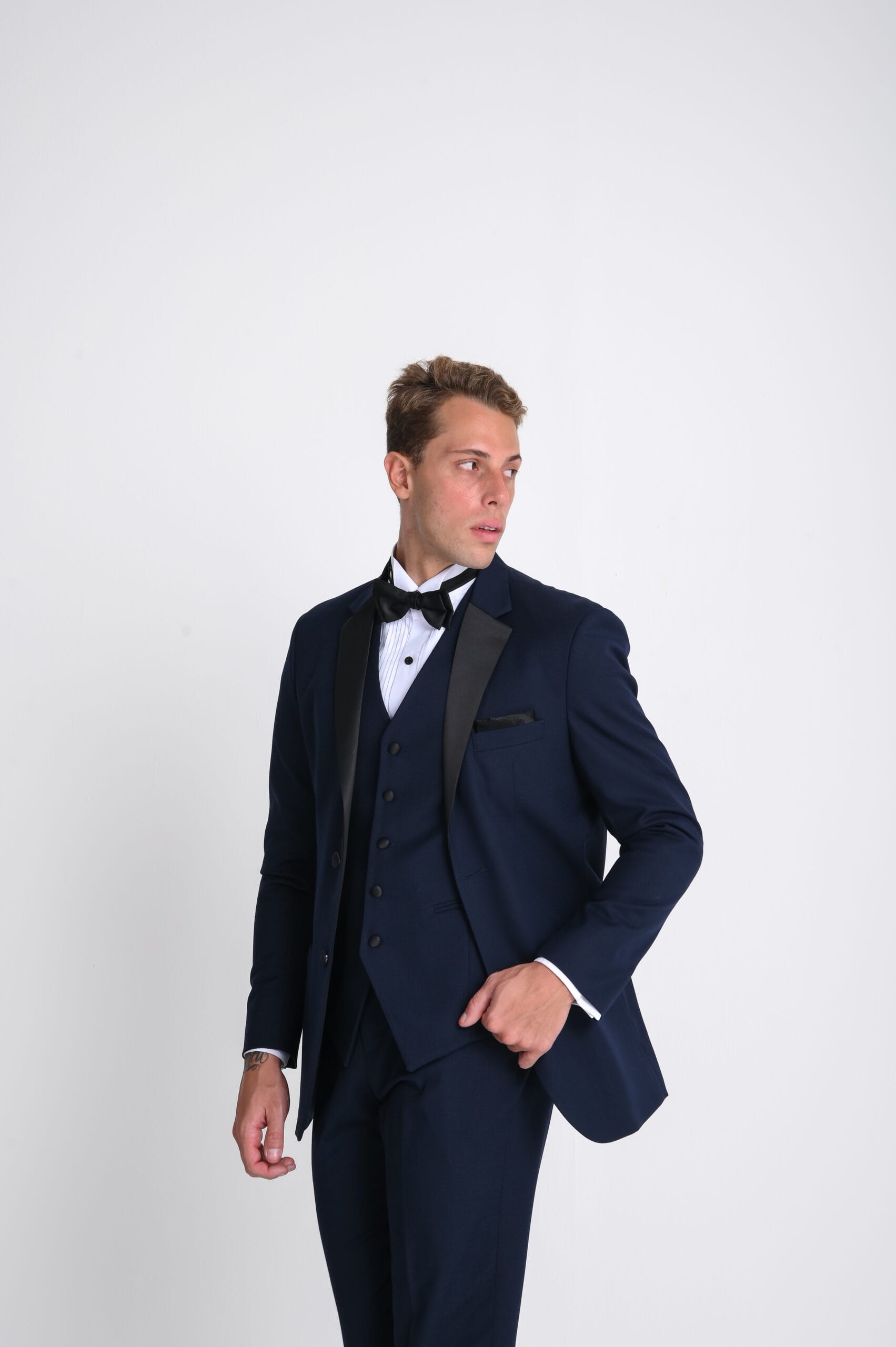 O Smoking Slim Azul Marinho traz sofisticação em cada detalhe, com lapelas em cetim preto que remetem à elegância clássica do traje a rigor. A modelagem ajustada valoriza o corpo masculino e o tecido de caimento estruturado garante conforto e imponência. Ideal para casamentos noturnos, formaturas e eventos black tie, é uma peça que traduz refinamento com um toque contemporâneo.